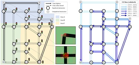 Test network layout and its configuration within the Eclipse SUMO traffic simulator (left); UE flows aggregated at a street level, as derived from Path4GMNS (right).
