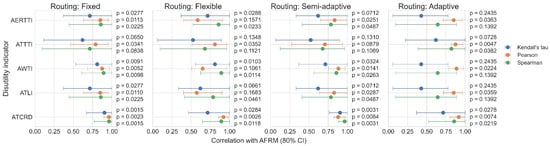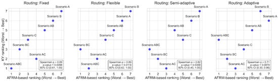 Figure 6 illustrates the relationship between AFRM-based scenario rankings and the Kemeny–Young (KY) aggregated rankings for each routing behavior, along with the corresponding Spearman correlation coefficients. Under fixed and flexible routing, AFRM accurately ranks the least critical scenarios (A, B, AB), with only minor discrepancies among the most critical ones, resulting in a high Spearman correlation of 0.89. Under semi-adaptive routing, discrepancies appear for scenarios of both moderate and high criticality, reducing the correlation to 0.82. Under adaptive routing, AFRM performs less consistently, showing noticeable discrepancies across scenarios of low, moderate, and high criticality, which further reduces the correlation to 0.71. The slightly advantageous aggregated ranking of flexible routing compared to semi-adaptive routing can be attributed to the more frequent dominance of the respective Kendall’s tau coefficients (see Figure 5).