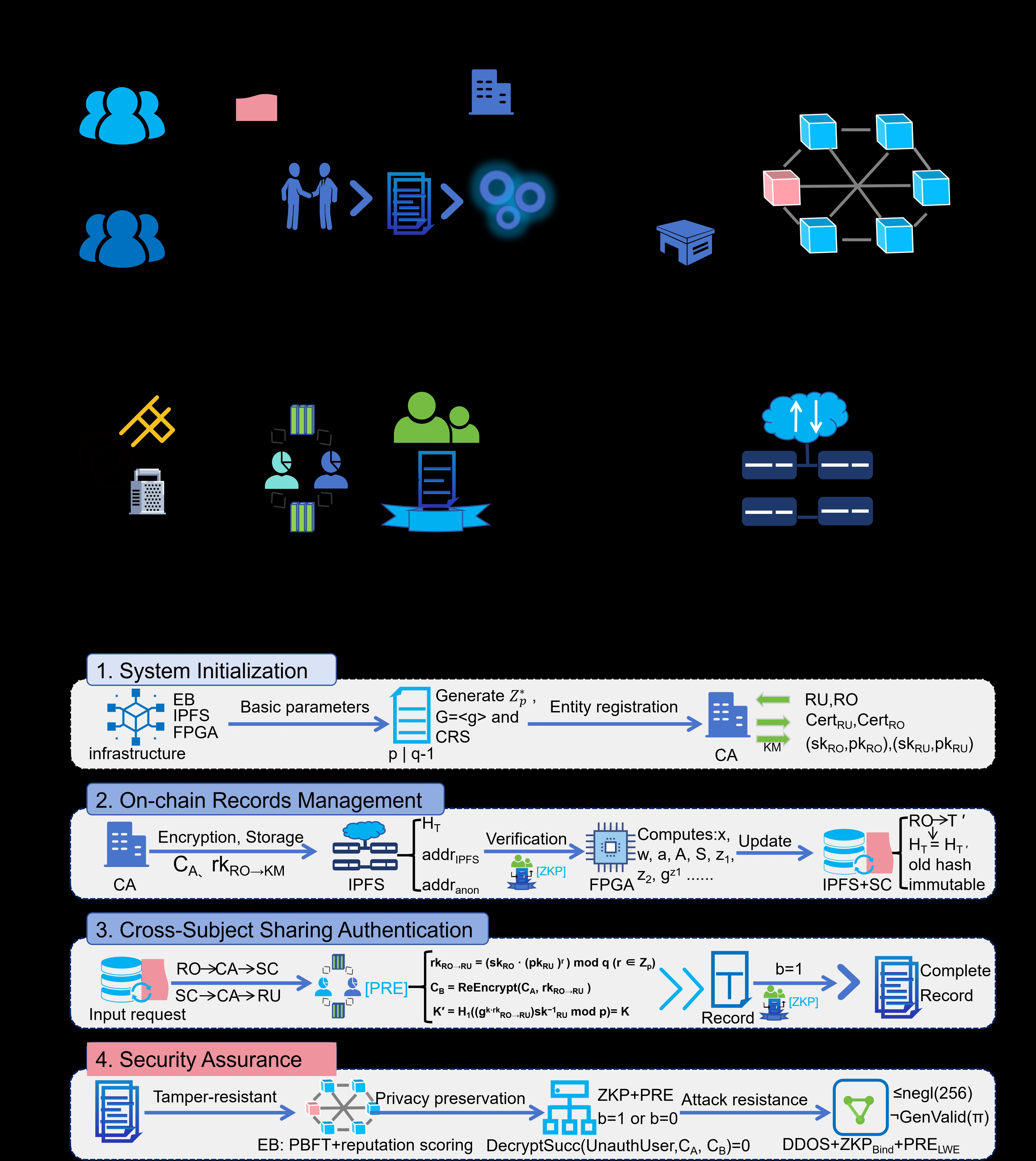 - Privacy Protection: ZKP ensures that the verifier only obtains the verification result without accessing the plaintext record. PRE ensures that only authorized data users can obtain the symmetric key to decrypt the record. The anonymous identity in x protects the real identity of and .