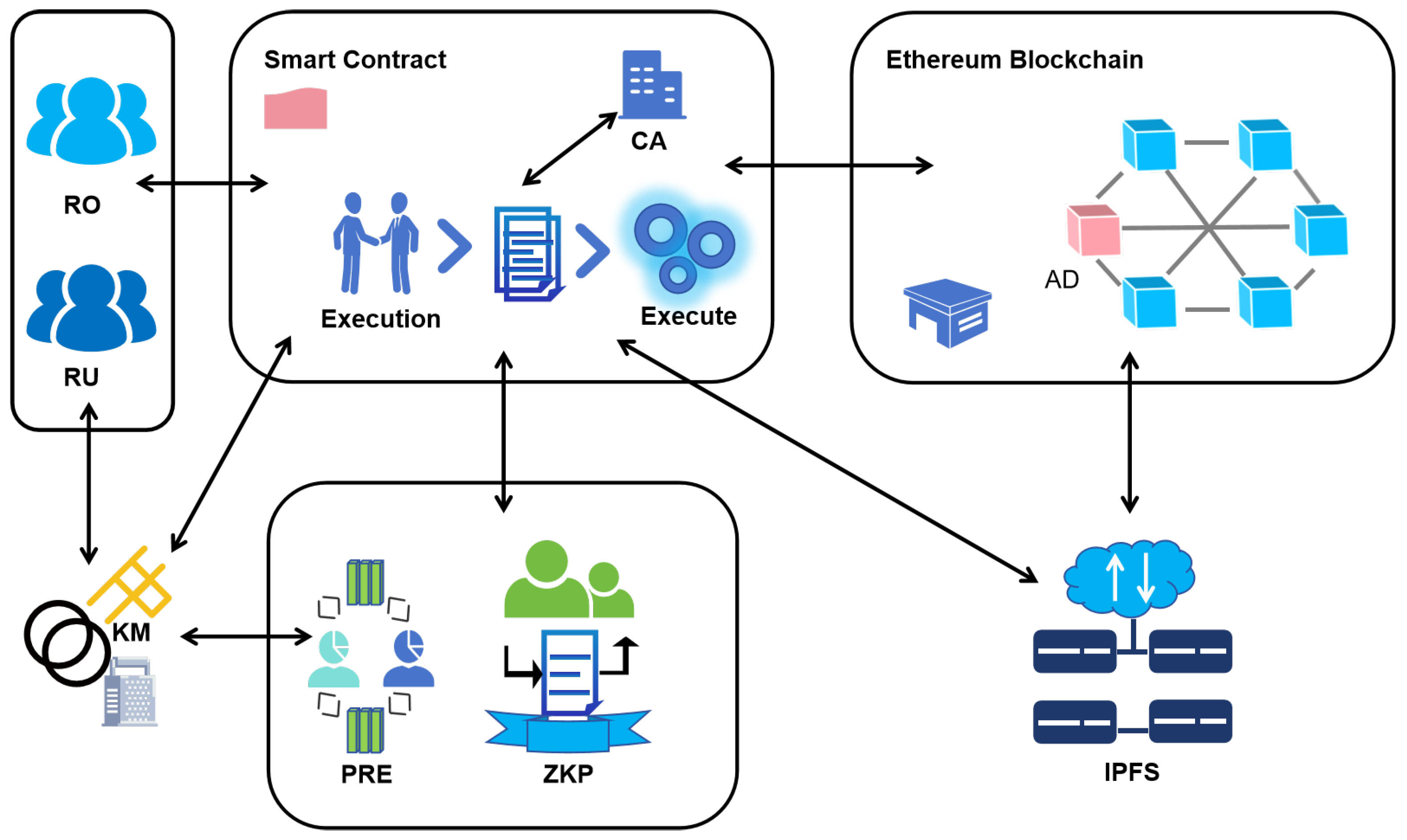- Key Manager (KM): Responsible for generating, distributing, storing, updating, and revoking encryption keys, supporting the PRE process, and integrating with SC to automate key management.