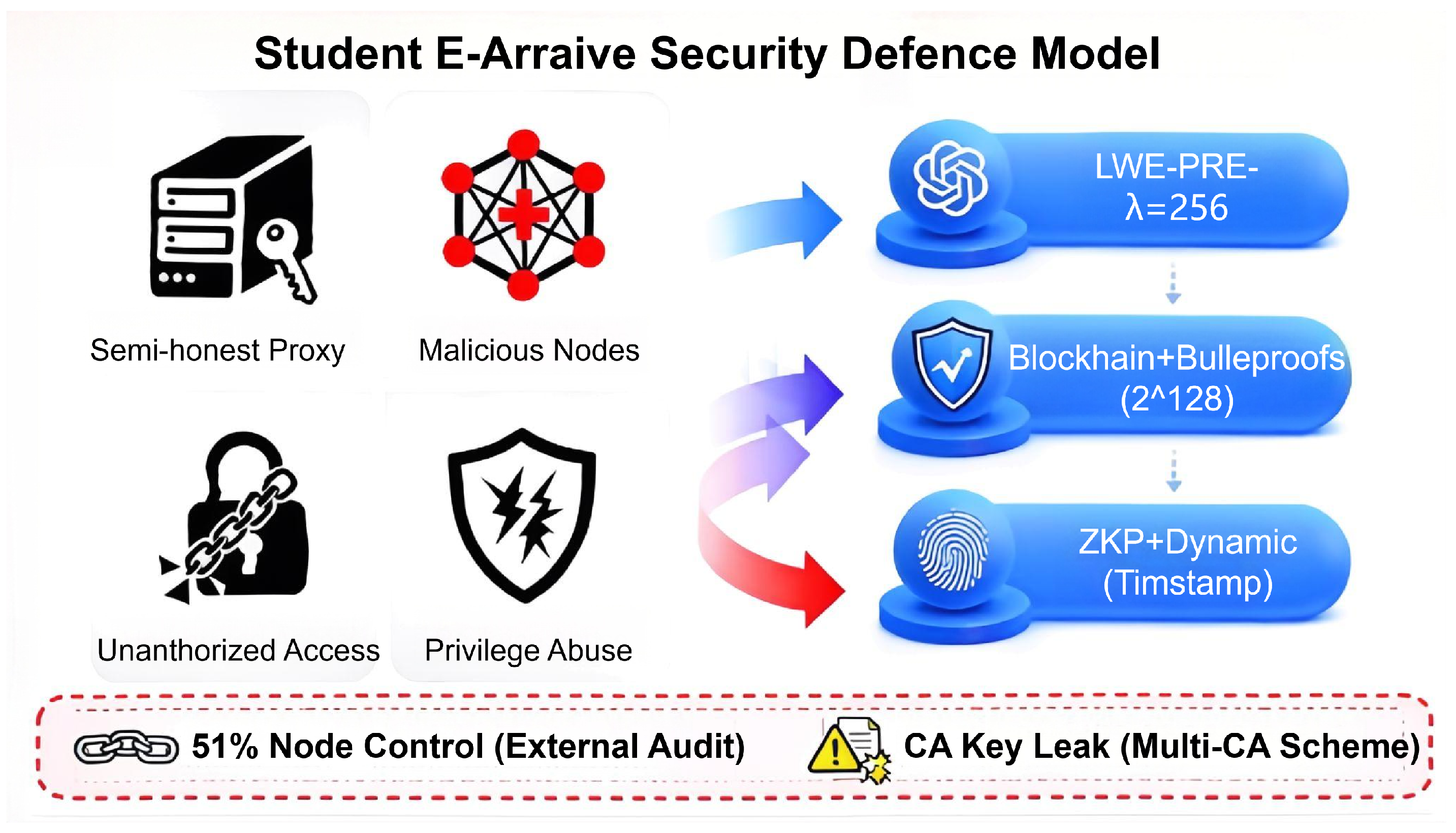 - External Unauthorized Attacks: Attackers without legitimate authorization intercept ciphertext transmission data through network eavesdropping or obtain user private keys through social engineering, attempting to decrypt unauthorized records or forge identities to bypass the compliance verification of the “Provisional Regulations on the Electronic Registration Management of Student Status in Universities”, threatening data privacy and access legitimacy.