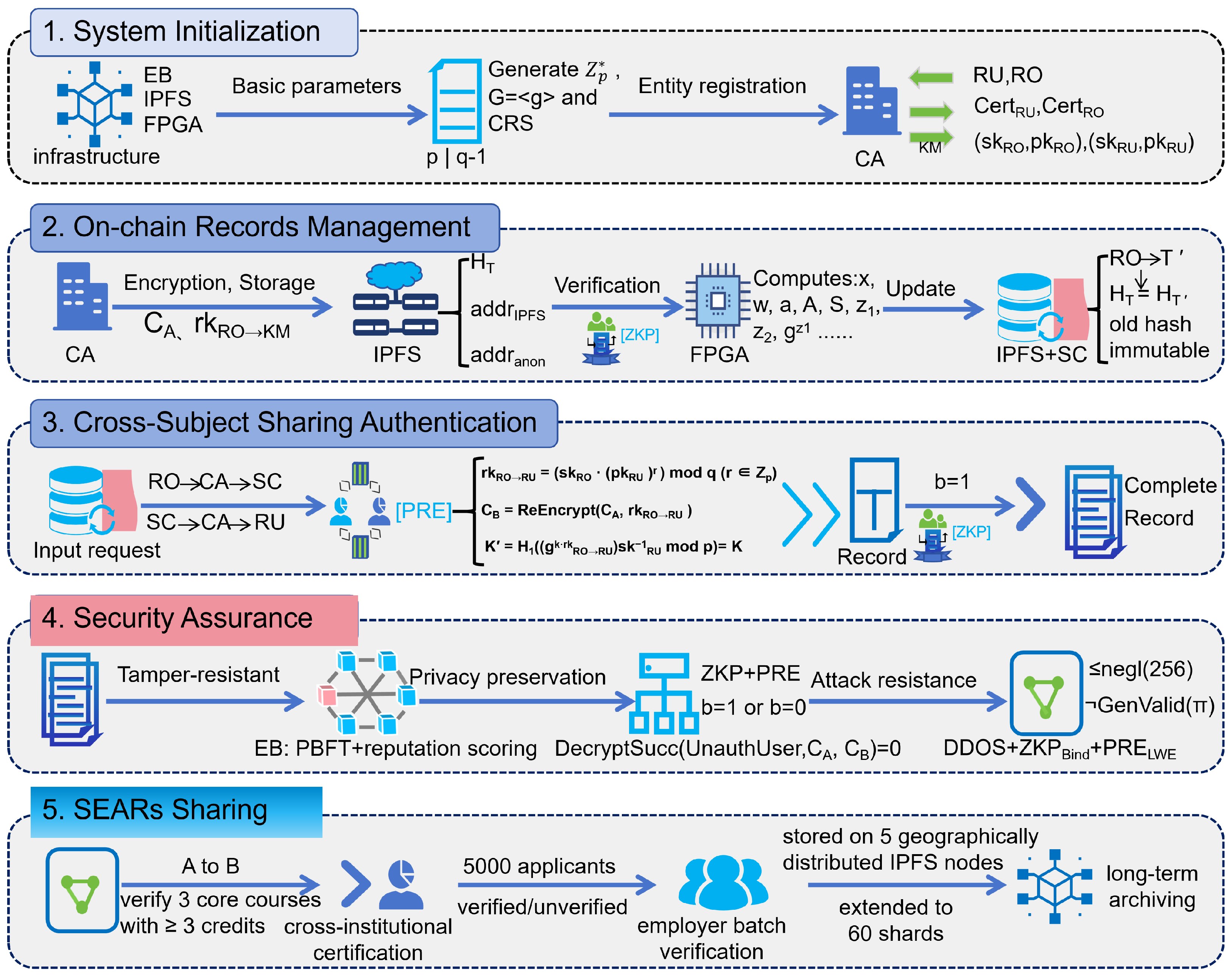 - ZKP: ZKP technology provides an efficient and privacy-preserving verification mechanism, allowing users to prove their identity or knowledge of data without revealing any sensitive information, thereby enhancing security and trust in the sharing process of electronic academic records.