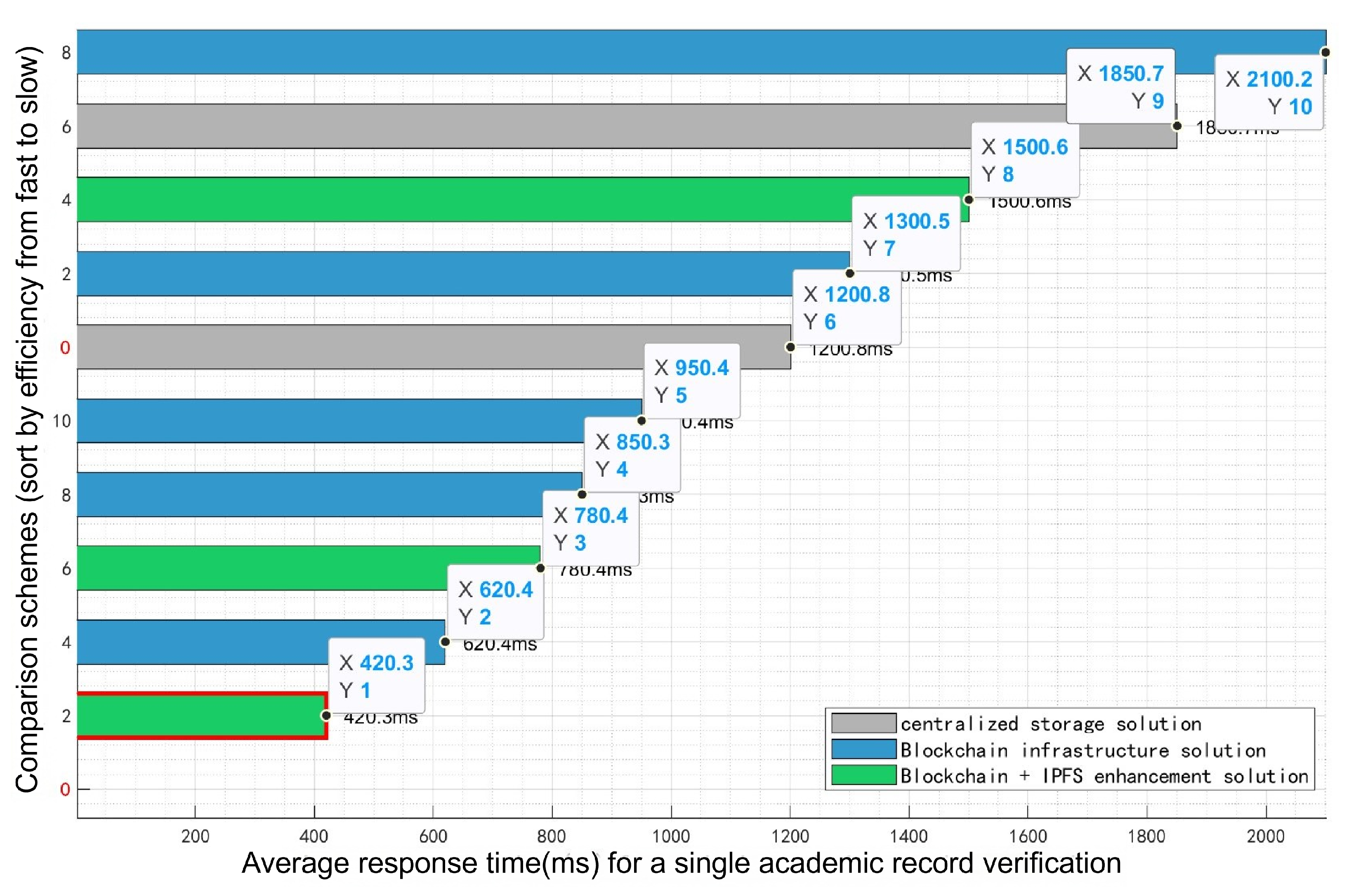 - It facilitates long-term archive storage: The distributed storage attribute based on IPFS solves the problem of insufficient blockchain storage capacity, and the compliance verification logic of the “Provisional Regulations on the Administration of Electronic Registration of Academic Certificates” and the “Information Protection Law” is embedded into SC. Addressing the 50-year long-term storage requirement of SEARs, the IPFS-blockchain integration ensures data durability while complying with education-specific archiving regulations.