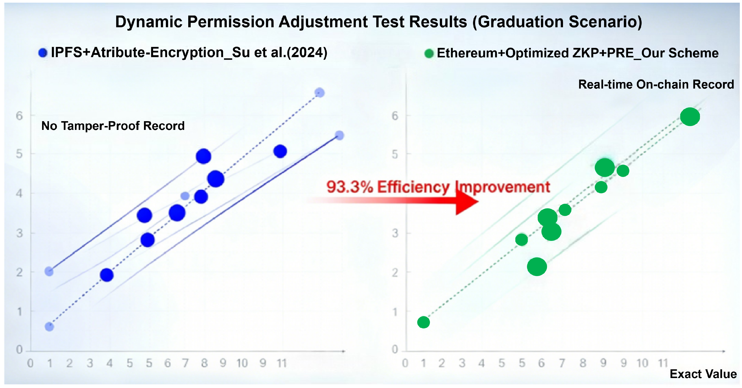 - It supports dynamic permissions adjustment: Through ZKP technology, the authenticity of archive information can be verified without disclosing the specific content of academic records. Meanwhile, PRE technology makes the authorization and sharing of academic records more secure and flexible. The entire process supports dynamic permissions adjustments, adapting to the privacy protection needs of archive records throughout their full lifecycle. Matching the dynamic permission changes of SEARs across lifecycles, this function adapts to the scenario-specific permission demands of students.