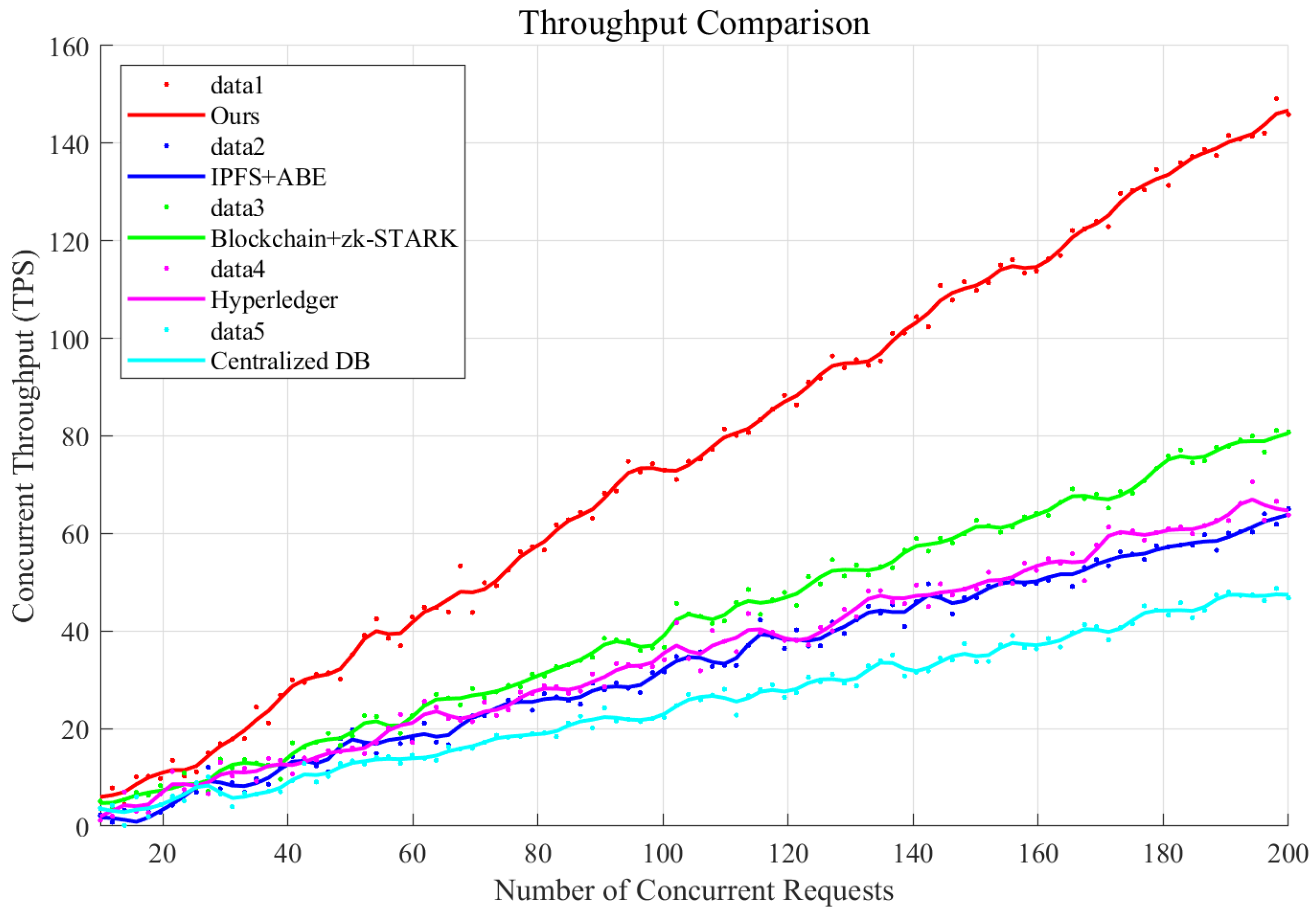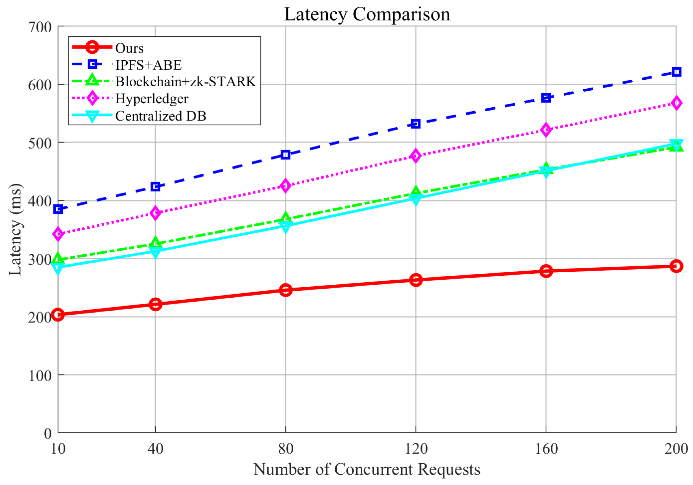 - The IPFS+ABE scheme [18] exhibits 385 ms latency at 10 requests (47.2% higher than the proposed scheme) and 621 ms at 200 requests (61.4% growth);
