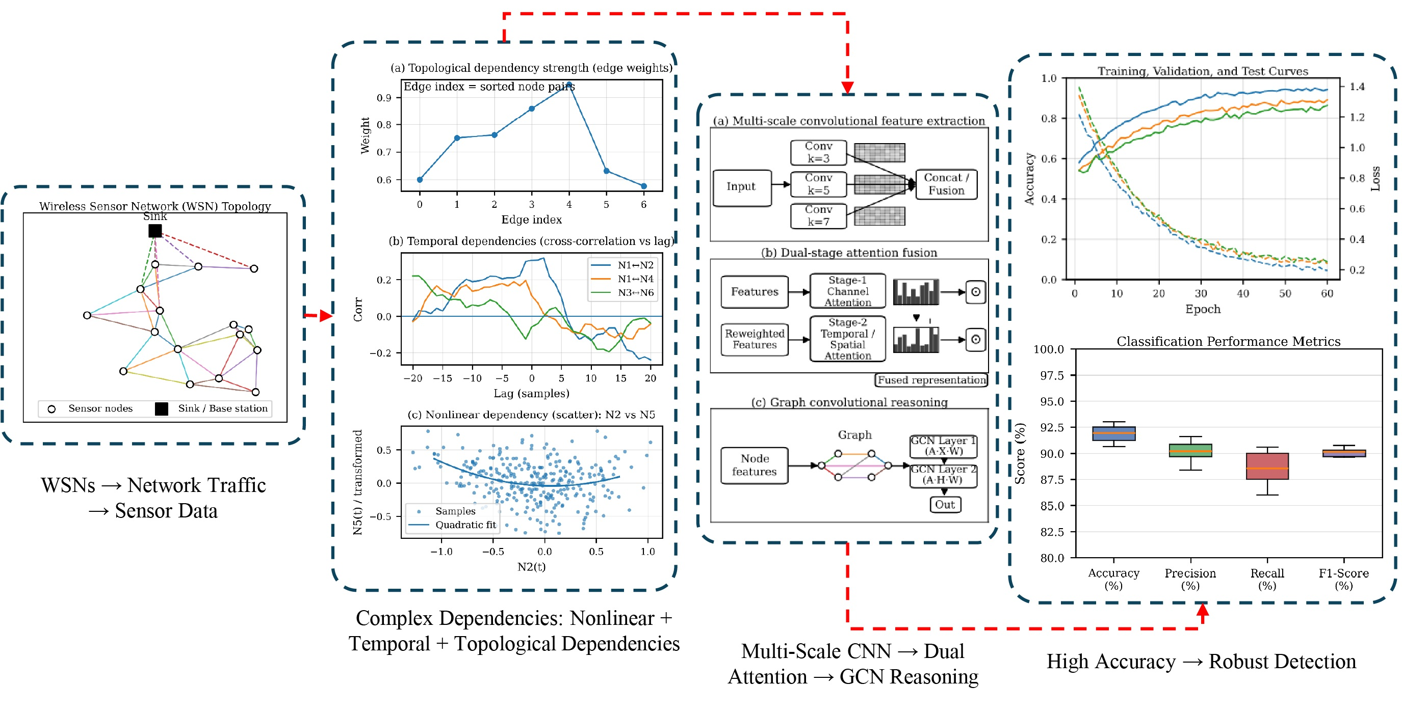 - It integrates multi-scale CNN, attention fusion, GCN, and BiLSTM to capture comprehensive spatio-temporal dynamics of WSN traffic.