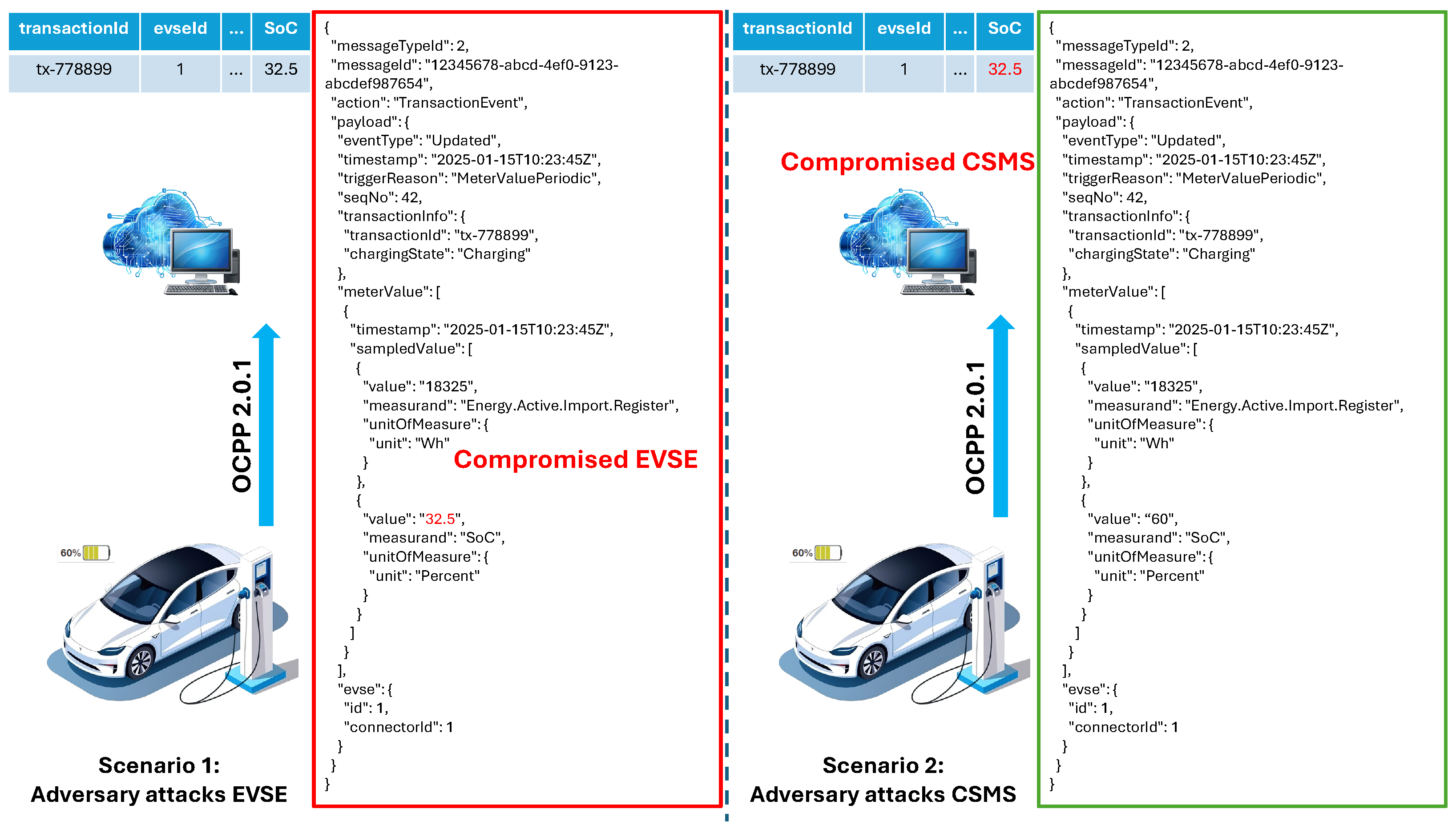 - We identify and define two SOC spoofing attacks (i.e., Priority Manipulation Attack and Session Extension Attack) and explain how adversaries can manipulate SOC values to obtain unfair charging priority, get around charging cutoff policies, and cause inaccurate wait time estimation, charging station congestion, and even grid instability.