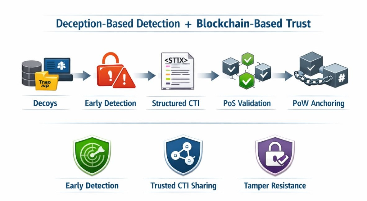 Altogether, this paper introduces two hard-nosed frameworks IRDS4C and CTIB that support intrusion and ransomware detection, as well as assured sharing of cyber threat intelligence. By combining deception methods with blockchain technology, the approach aims to strengthen both detection and prevention of cyber threats in corrupt environments. The work includes not only an architectural description, but also an executable CTIB prototype and controlled experiments that quantify end-to-end CTI publication latency and throughput. The idea here is to bridge tralatitious security tools with newer ones, while paying attention to things like scalability, reliability, and cooperation among different security groups.