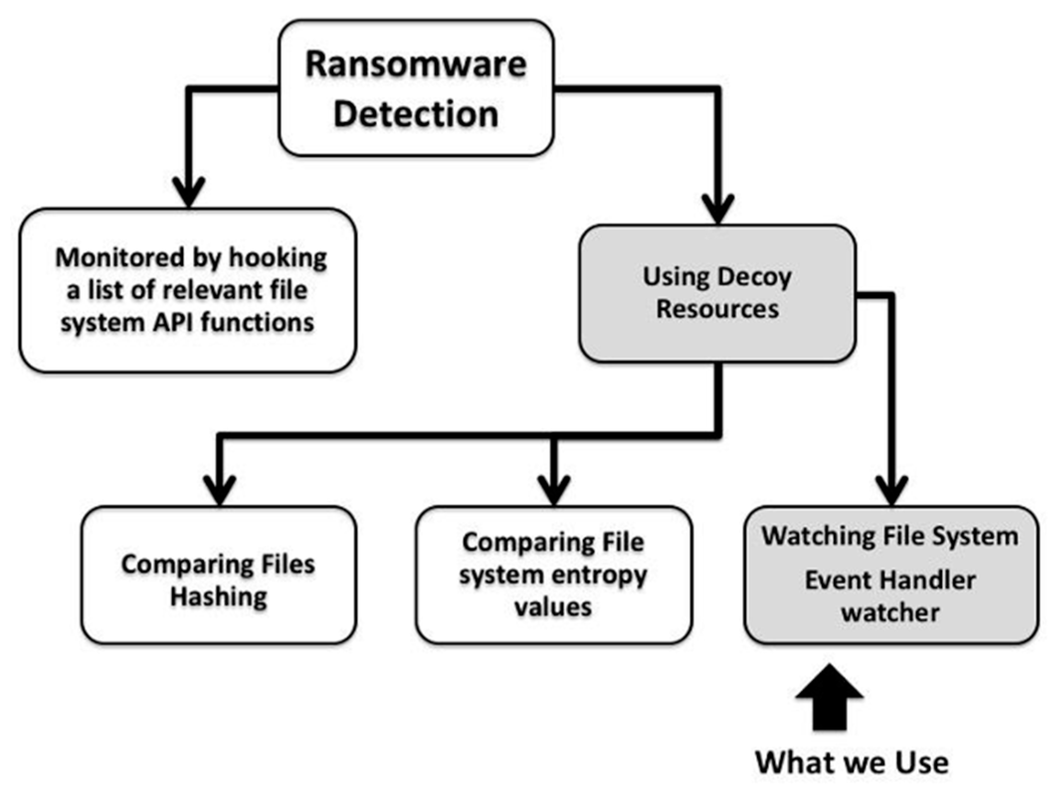 Some keyways include file hashing, file entropy analysis, and file event handler watcher. In this paper, we mainly focus on using the file event handler watcher API to monitor decoy resources, honey files, and honeytokens, which helps in ransomware detection as illustrated in