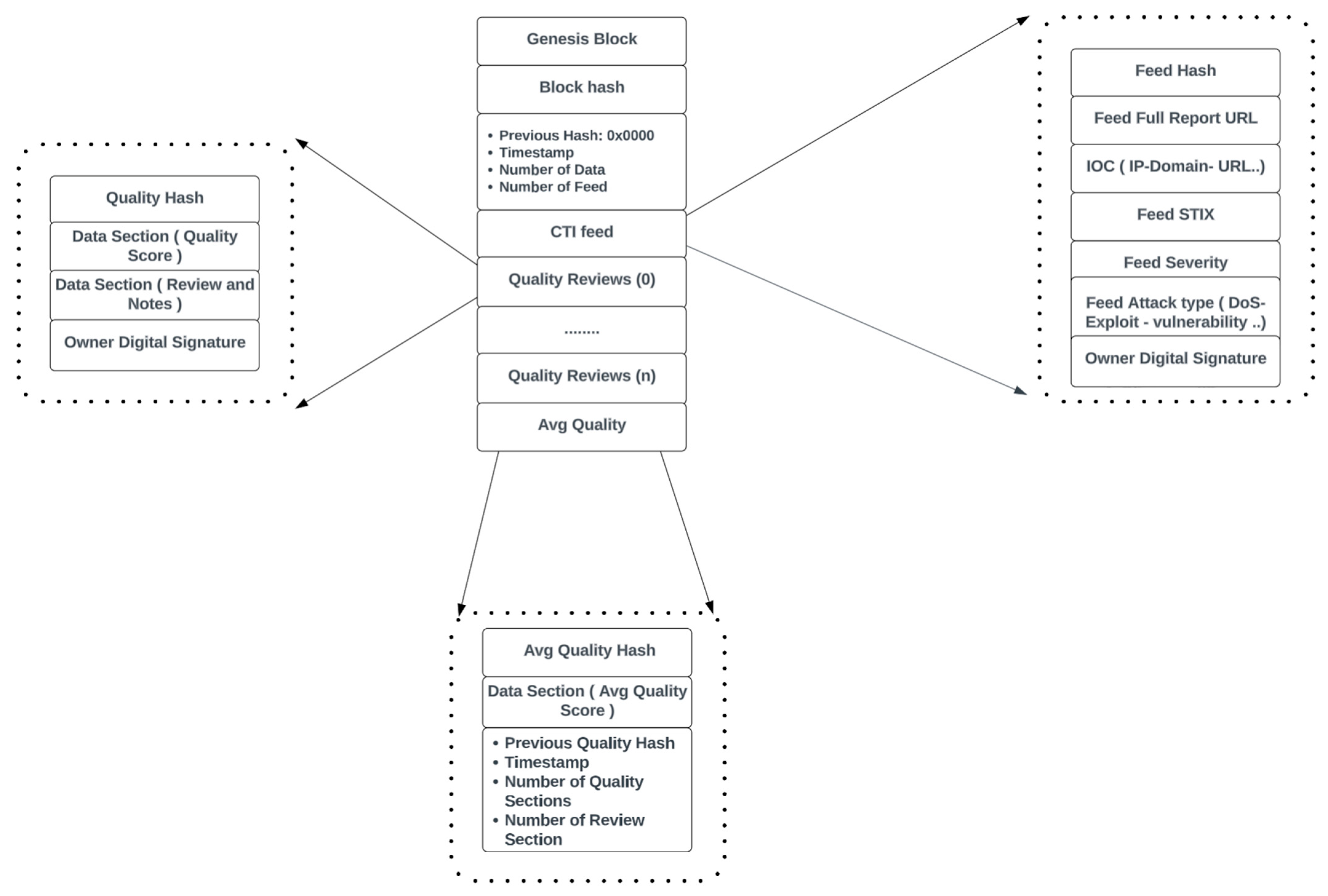 The structure also includes cti_feed, which details the threat intelligence feed, comprising a unique feed_hash, a feed_url for access, and Indicators of Compromise (IoCs) such as IP addresses, domains, URLs, severity levels, attack types, and the owner’s digital signature. Additionally, quality_reviews is currently empty as no evaluations have been recorded, and average_quality is initialized as a placeholder. This layout clearly defines the genesis block structure, with specific values adaptable according to implementation requirements, as illustrated in