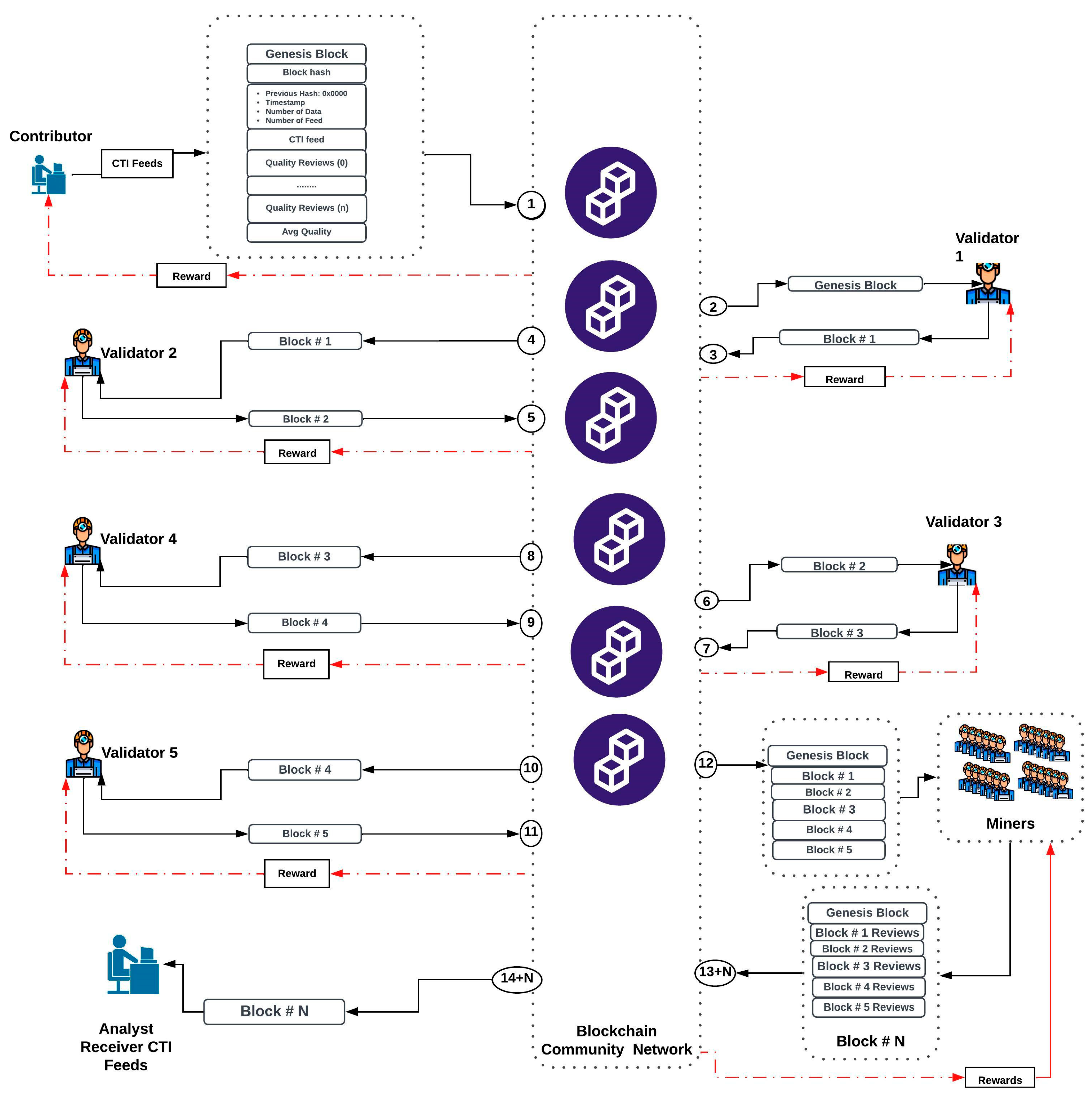 A group of validators assigns scores based on usefulness, reliability, and timeliness. Only CTI records meeting predefined thresholds are published on-chain. All validation decisions are immutably logged, promoting transparency and accountability. The Incentivized CTI Model [