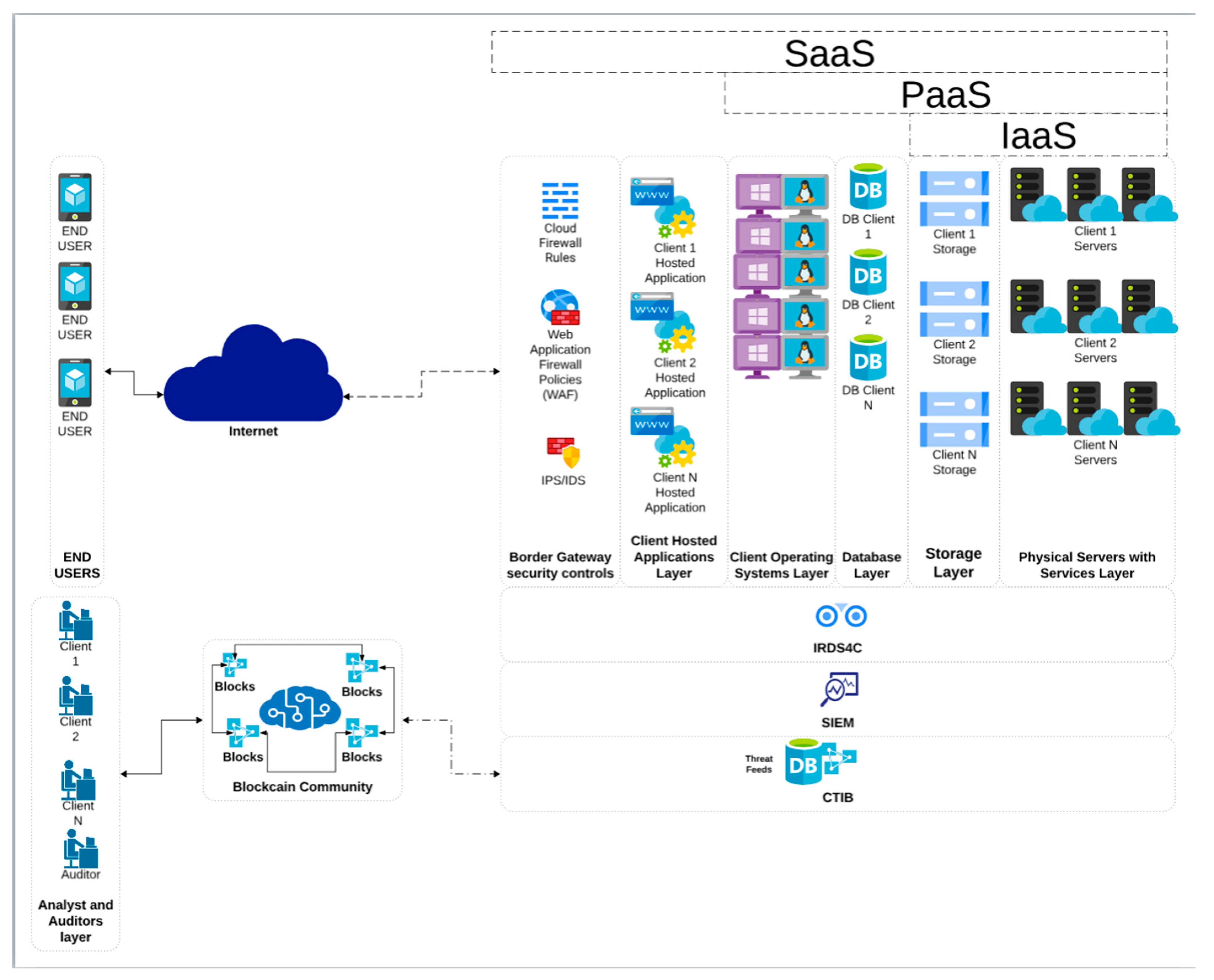 Figure 4 depicts the integration of CTIB and IRDS4C, connecting various cloud service models, Software as a Service (SaaS), Platform as a Service (PaaS), and Infrastructure as a Service (IaaS), with serious security components such as IRDS4C, SIEM, and CTIB. This combined framework facilitates seamless interactions among cloud service providers, clients, auditors, and end-users, thereby enhancing the overall cybersecurity infrastructure. Within this architecture, IRDS4C operates as the core detection mechanism, leveraging deceptive elements such as honey files and honeypots to identify malicious activities. It transmits alerts to the SIEM, which aggregates logs from multiple security sources, including WAFs, IDS/IPS, and IRDS4C, to conduct deeper analysis and detect coordinated attacks. The CTIB framework securely disseminates CTI among authorized participants using blockchain technology.