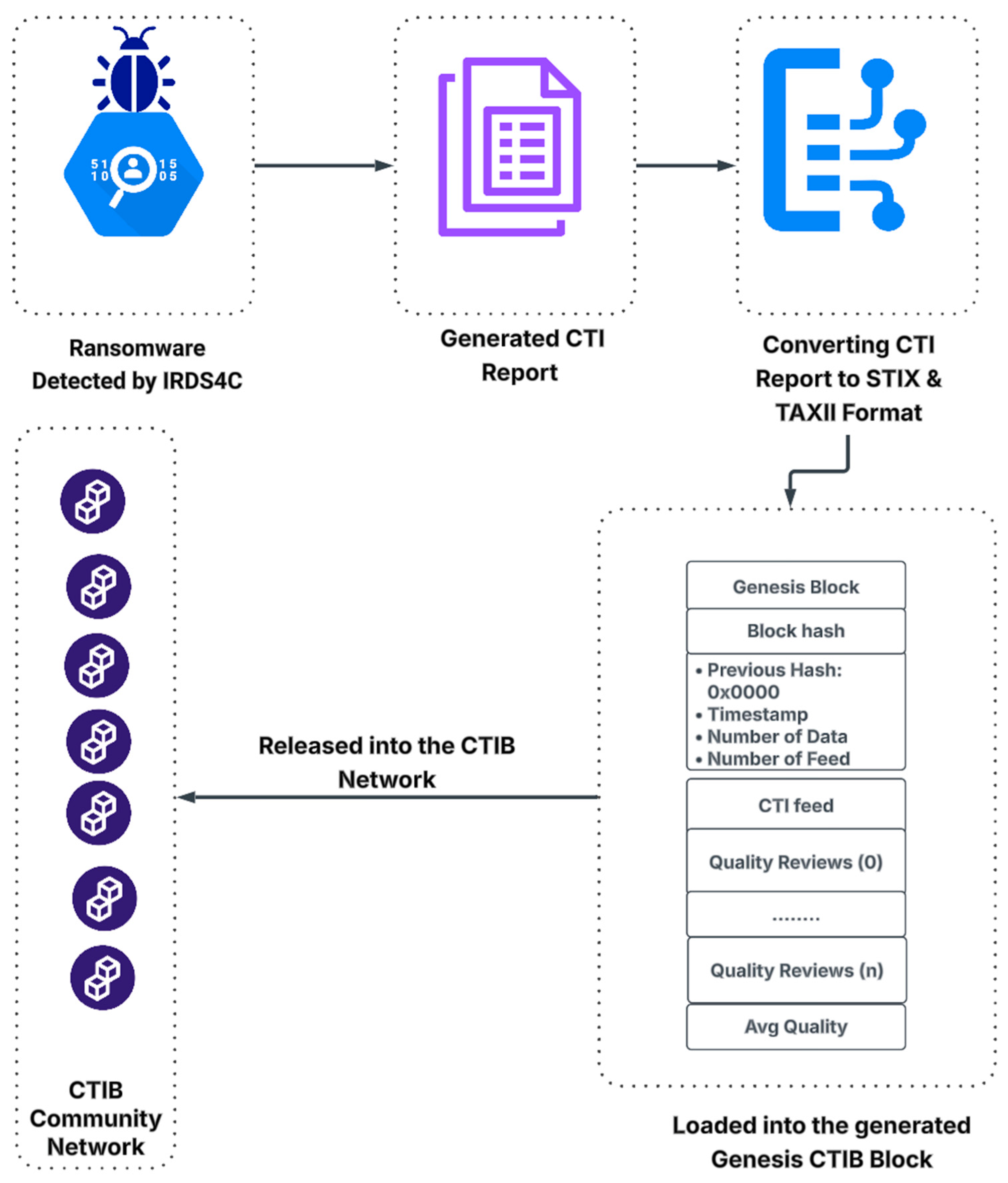 48]. This rapid detection capability is crucial for minimizing the impact of ransomware attacks. Following detection, all relevant information is compiled into a structured report, which is then converted into the STIX and TAXII formats. This structured threat intelligence is subsequently embedded into the genesis block of the CTIB blockchain and released into the CTIB network for secure and transparent dissemination. The following phases will provide a detailed discussion of the integration and operation of the proposed frameworks.