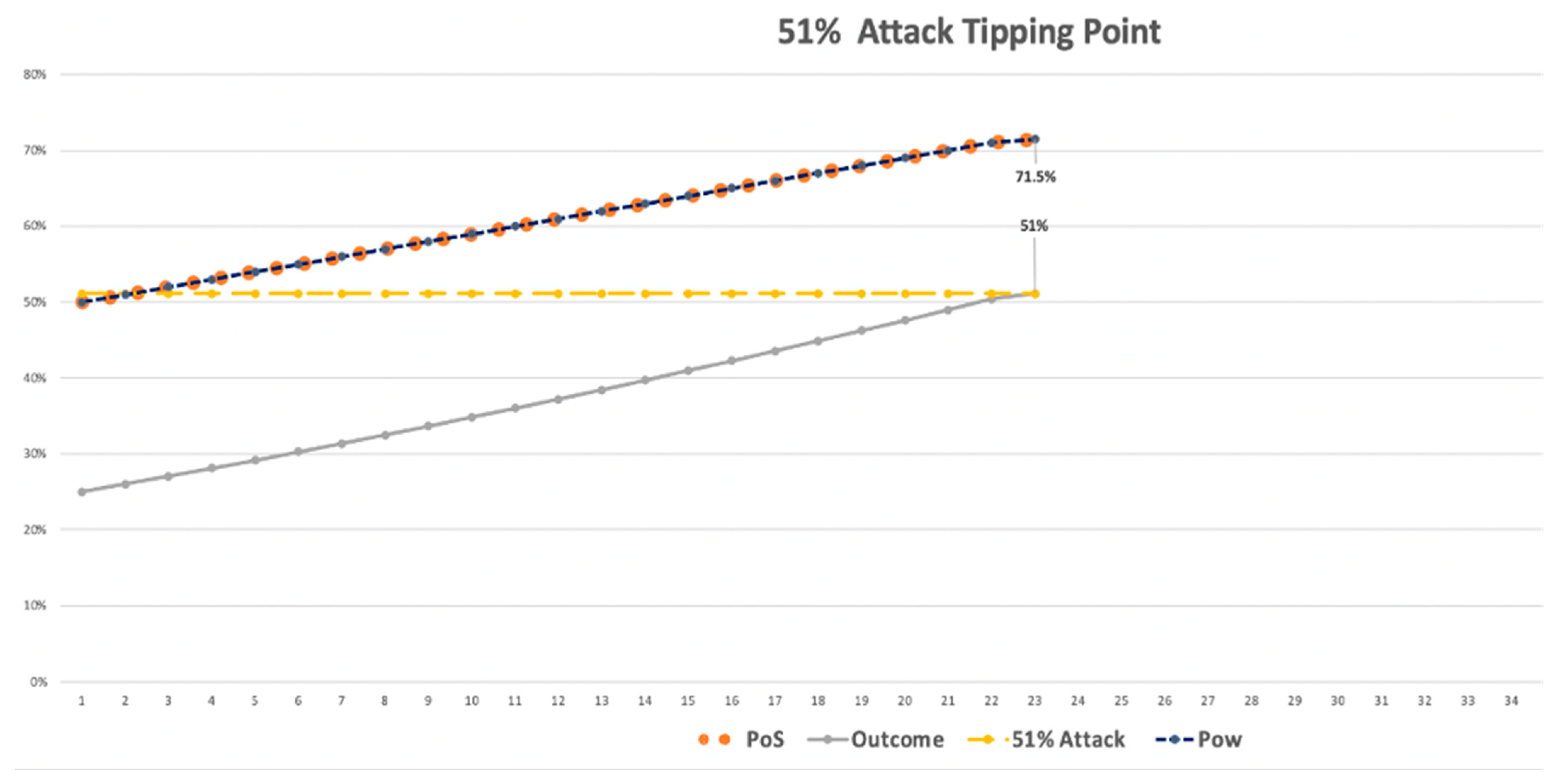 17], this number comes from basic probability equations that describe how the two parts of the system work together. The attacker must win the mining race in PoW and be selected as a validator in PoS at the same time. When these two probabilities are multiplied, the chance of success drops sharply, so reaching 51% becomes almost impossible without taking over most of the whole network. This threshold is derived under idealized analytical assumptions, including independence between PoW and PoS control probabilities, homogeneous validator behavior, and the absence of network latency, adaptive adversaries, or strategic collusion effects. As such, the 71% value should be interpreted as an upper-bound security intuition rather than a precise real-world attack probability. A short explanation of these probability equations is provided in the appendix (