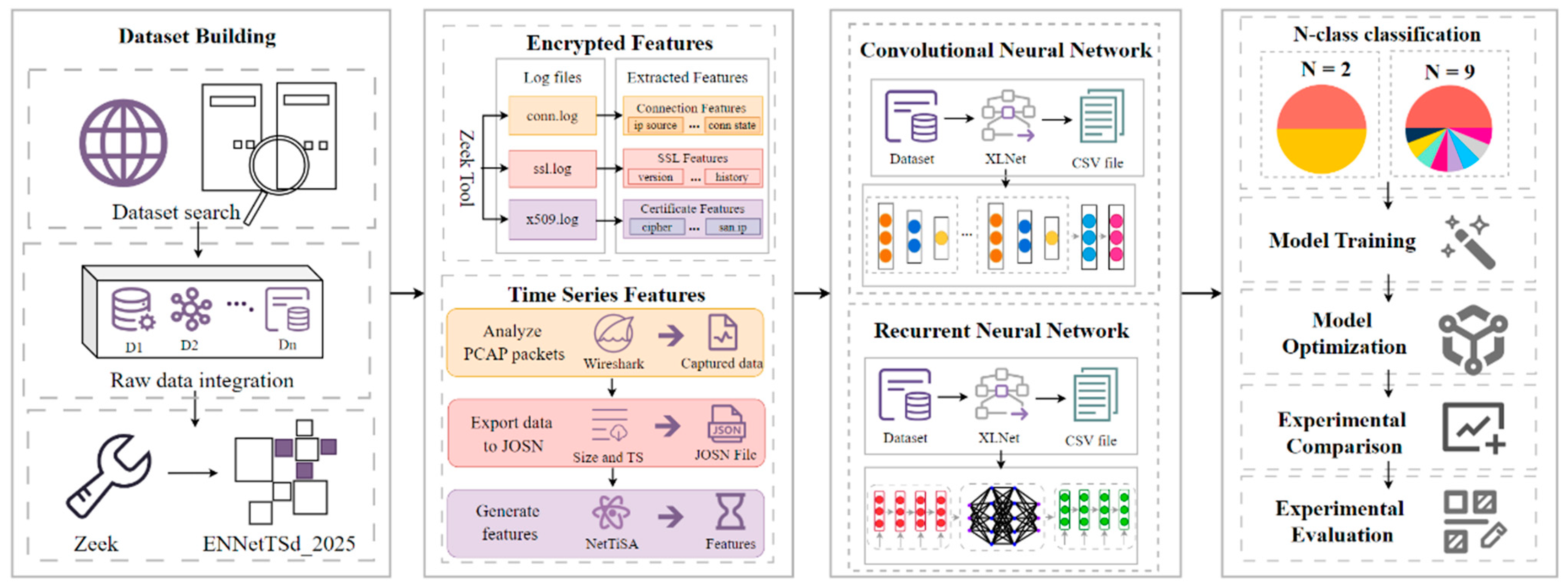 In conclusion, this study combined SSL/TLS encryption features, time-series analysis, encoding techniques and deep learning to propose a more accurate and efficient encrypted malicious traffic detection method. We proposed using both encryption features and time-series features in our experiments. In order to effectively capture the temporal dependency in traffic data, we employed a transformer-based XLNet encoding model for feature representation, which enhances the model’s ability to understand sequence patterns. By integrating a convolutional neural network (CNN) and a recurrent neural network (RNN), the model extracts local temporal features and captures long-term dependencies, thereby improving detection accuracy and optimizing training and testing efficiency.