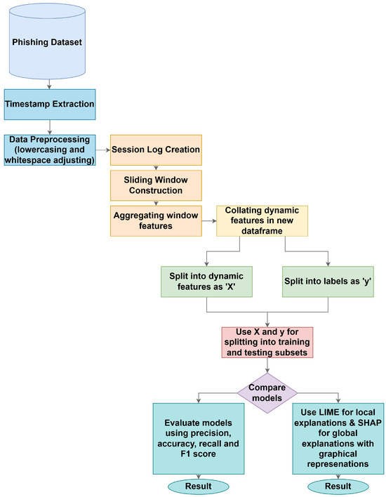 To address both the black-box issue of the lack of explainability in machine learning models [32] and the lack of temporally informed phishing detection models, we propose a temporally aware dynamic feature-extraction model with XAI. Our methodology processes phishing emails using a sliding-window analysis, combined with multi-model learning and XAI, as outlined in Figure 1.