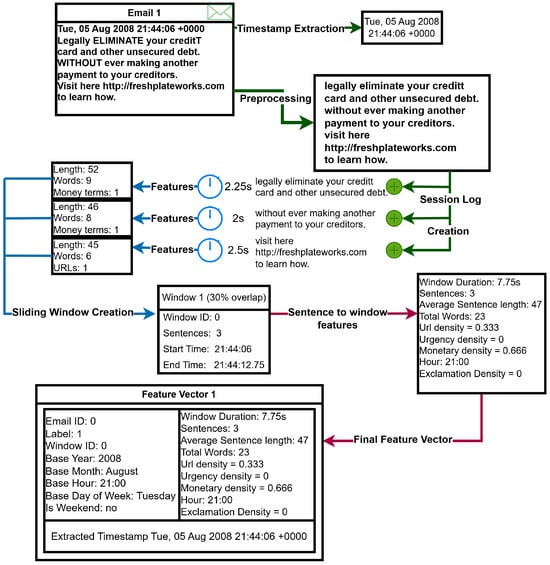 The function shown in Algorithm 2 begins by extracting the timestamp from the raw emails to record the sending time, enabling subsequent analysis of session logs to be viewed in a real temporal context. A new column is then added to the dataset, with emails without timestamps filtered out, to align features with their extracted timestamps. Each email’s text is divided into sentences, and reading times are simulated to generate a chronological sequence of session logs. Each log captures the sentence content, its local timestamp from simulated reading, and relevant sentence-level features. The ordered session logs are then grouped into overlapping windows using a sliding window function, with a default window size of 7 session logs and 30% overlap, thereby preserving the order of sentences and their temporal context and enabling the detection of short-range behavioural patterns, such as monetary and urgency terms.