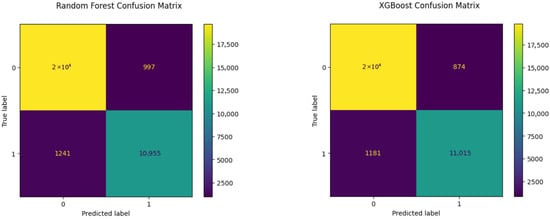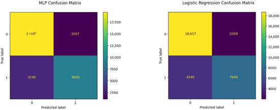 In addition, the confusion matrices shown in Figure 3 and Figure 4 reveal clear performance hierarchies and specific strengths and weaknesses of each approach in processing temporal phishing features. They show that XGBoost achieved the fewest false positives and false negatives, with 874 and 1181, respectively. In security, false negatives are critical because they represent missed threats; thus, showing that logistic regression had 4348 false negatives compared with XGBoost (1181) demonstrates the practical value of tree-based approaches such as Random Forest and XGBoost for real-world deployment versus other methods, such as neural networks and linear approaches.