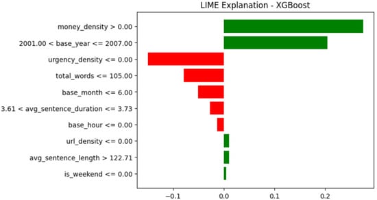 To set up LIME, shown in Listing 2, the LimeTabularExplainer was initialised using the training feature matrix, along with the feature names, the class names of ‘Phishing’ and ‘Legitimate’, as well as setting it in classification mode. Subsequently, the explainer was applied to each classifier model to generate local explanations for specific emails by perturbing the input features and observing changes in the classifier’s output probabilities. LIME then fitted a simple, interpretable graphical representation of horizontal bars that showed which features were most important in its classification decisions.