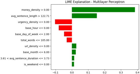 The multilayer perceptron model, LIME explanation shown in Figure 7, places average sentence length higher than the other models and exhibits more balanced feature contributions to classification, indicating that neural networks use a broader feature set than other classifiers. The LIME explanation of the logistic regression model, shown in Figure 8, illustrates the most diverse pattern in how the features have been utilised. URL_density shows a greater negative contribution than the other models, which may explain its lower accuracy.
