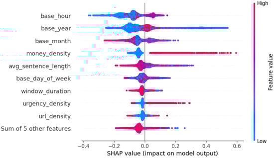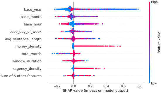 SHAP was also applied to each classifier using a sample size of 10,000 to obtain a global overview of feature importance. In the Random Forest SHAP beeswarm, shown in Figure 9, base_hour is the most influential feature, with a strongly bidirectional effect: some hours show negative SHAP values (blue, left) while others contribute positively (red, right), indicating pronounced temporal patterns learned by the model. Base_year exhibits a large, asymmetric spread with higher years pushing SHAP values to the right, consistent with temporal drift toward higher predicted risk in more recent messages. Money_density shows a clear pattern, where a greater density of monetary terms produces a long red right tail of positive contributions. Avg_sentence_length has a moderate, mixed-direction impact: unusually short or long sentences nudge predictions, but most points cluster near zero. Url_density is generally low overall, yet a subset of high-value cases shifts predictions to the right, implying that links increase risk in specific emails. Seasonal and weekly effects from base_month and base_day_of_week are present but modest, centred near zero with small left/right shifts. Finally, window_duration displays a small-to-moderate positive skew, suggesting certain durations increase predicted risk, though its overall contribution is secondary.