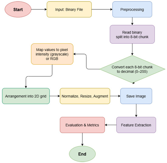 Thus, recent research has shifted to image-based malware analysis, which converts executable binaries into visual representations that can be processed by deep learning models [5,7]. Each malware binary is treated as a one-dimensional sequence of bytes , where each byte value is assigned to a grayscale pixel intensity (0–255). The resulting image I is defined as: