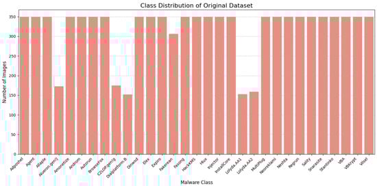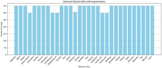 where I denotes the set of original malware images. Synthetic samples were generated in a class-wise manner until each malware family reached an approximately uniform number of samples. Figure 2 and Figure 3 illustrate the class distribution before and after DCGAN-based balancing, respectively. As observed, the proposed augmentation strategy substantially enriches minority classes, resulting in a more uniform dataset distribution that is better suited for robust and unbiased classifier training.