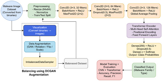 Overview of the proposed CNN-Transformer hybrid framework for image-based malware classification, integrating DCGAN-based data enhancement and supervised learning.