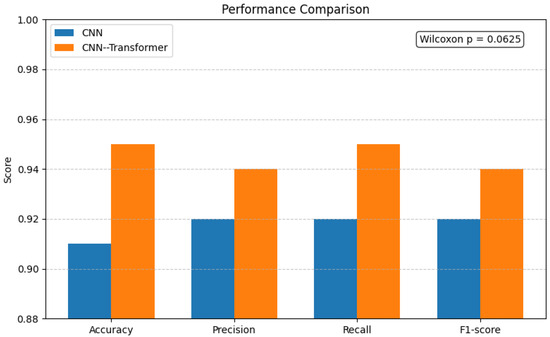 A paired non-parametric Wilcoxon signed-rank test was performed on macro-averaged Accuracy, Precision, Recall, and F1-score values obtained from 10 paired observations (10-fold cross-validation/10 repeated runs using identical splits for both models). The Wilcoxon signed-rank test is appropriate for paired comparisons when normality of differences cannot be assumed. For all four metrics the test produced a statistic of with p-value , indicating that the CNN–Transformer hybrid consistently outperformed the CNN baseline across the paired runs. After applying a Bonferroni correction for the four simultaneous tests (), all p-values remain below the corrected threshold and are therefore statistically significant. The directionality of every paired difference (each of the 10 observations favored the hybrid model) and the substantial mean improvements reported in Table 6 collectively support the robustness of the observed performance gains, as shown in Figure 5.