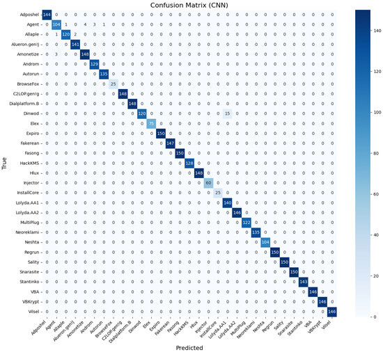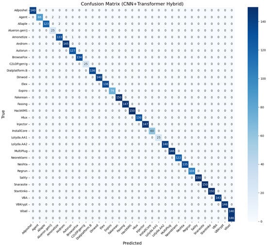 To gain deeper insight into class-wise prediction behavior across the 31 malware families, confusion matrices were generated for both the CNN baseline and the proposed CNN–Transformer hybrid model, as illustrated in Figure 6 and Figure 7. These matrices provide a detailed view of classification strengths and remaining challenges at the family level. The CNN baseline demonstrates reasonable recognition for several dominant malware families; however, it exhibits a higher number of off-diagonal errors, particularly among visually similar families such as Agent, Allaple, Autorun, and Regrun. In addition, minority classes with limited original samples, including Alueron.gen!J and Dialplatform.B, show scattered misclassifications, indicating insufficient feature discrimination under data imbalance. In contrast, the CNN–Transformer hybrid model produces markedly sharper diagonal patterns with substantially fewer off-diagonal entries, reflecting improved class separability. Minority families that originally contained fewer than 30 samples achieve near-perfect or perfect classification, highlighting the effectiveness of GAN-based data augmentation in enriching underrepresented classes with representative samples. Furthermore, the Transformer encoder enhances global feature modeling, reducing confusion among structurally similar families such as FakeRean, Fasong, and Expiro, which appear as cleaner and more concentrated diagonal entries in the hybrid confusion matrix. Overall, this analysis confirms that the proposed hybrid framework significantly improves both majority- and minority-class discrimination, making it well suited for real-world malware detection scenarios.