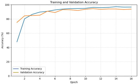 Training and validation accuracy curves. The CNN–Transformer hybrid becomes stable around 95% validation accuracy.