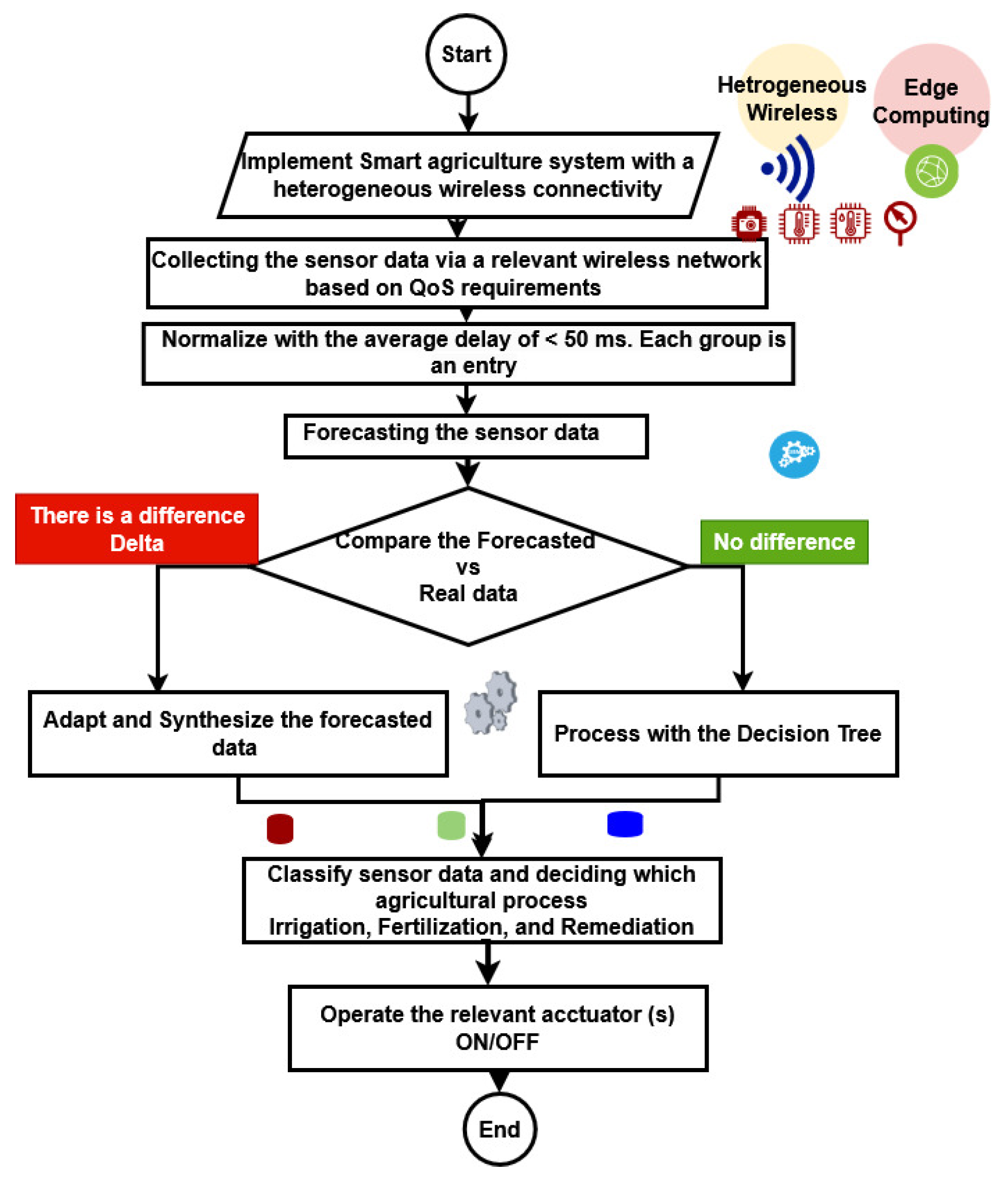 - Proposing an intelligent edge solution that adopts the Hybrid-DT algorithm for managing remote farm fields that lack internet connectivity.