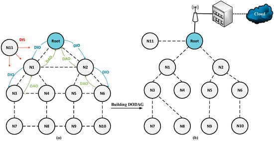 According to Figure 1, RPL uses the control messages to build DODAG, including DODAG Information Object (DIO), DODAG Information Solicitation (DIS), Destination Advertisement Object (DAO), and DAO Acknowledgment (DAO-ACK) [18]. DIO is responsible for transmitting network information between IoT nodes. Network nodes utilize DIO and DIS messages to establish upward traffic routes, while DAO and DAO-Ack messages are used to support downward traffic routes.