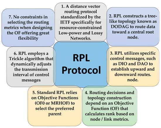 - Darabkh, K.A.; Al-Akhras, M.; Zomot, J.N.; Atiquzzaman, M. RPL Routing Protocol over IoT: A Comprehensive Survey, Recent Advances, Insights, Bibliometric Analysis, Recommendations, and Future Directions. J. Netw. Comput. Appl. 2022, 207, 103476. [Google Scholar] [CrossRef]