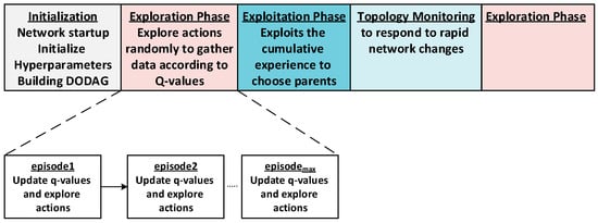 Accordingly, this paper introduces a load-balanced, energy-efficient, and congestion-aware routing mechanism called Aris-RPL for RPL-based IoT networks, leveraging Q-learning to enhance routing. The proposed approach operates in three main phases: (1) After network initialization, the exploration phase explores potential actions for network status. (2) The exploitation phase exploits the cumulative experience to make optimal routing decisions. (3) The network topology monitoring and management phase monitors network topology to respond to rapid network changes, ensuring performance and stability. Figure 5 shows the sequence of the approach’s three phases. The following sections will present further details.