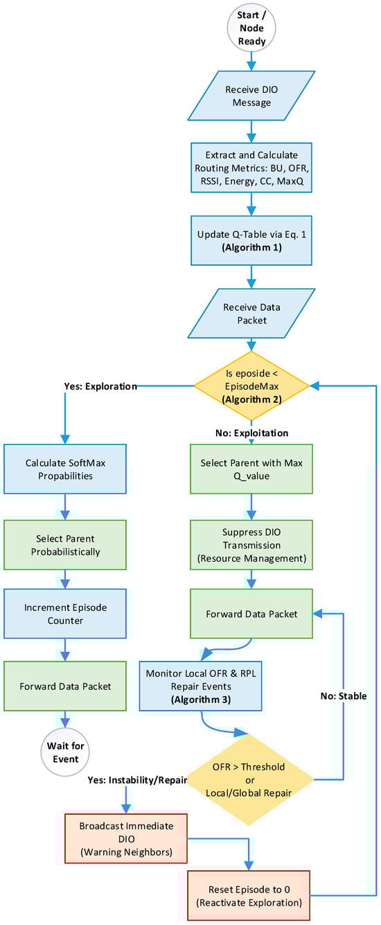 Besides the previous reinforcement learning, an emerging research direction has started applying advanced Deep Reinforcement Learning (DRL) techniques to address complex IoT routing challenges and showing potential future solutions to improve Aris-RPL to better handle network dynamics and cooperation between network nodes. For instance, the work in [43] proposed a hybrid architecture combining DRL with Graph Neural Networks (GNN) to better adapt to dynamic network topologies and enhance DRL decision-making. This work can be used in edge- or cloud-based scenarios because of the high computational cost. Most recently, Authors in [44] presented a Federated Double Deep Q-Learning (DDQN) approach, enabling sensors to collaboratively train routing models for latency and energy optimization without sharing raw data and with increased synchronization overhead. Recent works such as [45] demonstrate the efficacy of reinforcement learning in handling distributed resource management challenges found in WSNs. The authors proposed a distributed deep reinforcement learning framework that models the interaction between Wireless Devices and Roadside Units in Cooperative Intelligent Transportation Systems (C-ITS) as a Stackelberg game to address limited battery energy and computing power, validating their approach through numerical simulations. However, their work focused on resource allocation and offloading layers rather than the network layer of LLNs. Additionally, the research work in [46] proposed a distributed routing algorithm for multi-hop LoRa networks based on Multi-Armed Bandit (MAB) learning. The approach achieved a reduction in energy consumption and an improvement in PDR. While effective in its domain, it mainly focused on message-based LoRa communication, which fundamentally differs from the IEEE 802.15.4 standard framework utilized by Aris-RPL. Moreover, the researchers in [47] proposed a Multi-Armed Bandit Bayesian-based algorithm for WSN environmental. The protocol achieved throughput, scalability, and control overhead enhancements.. However, it relied on a centralized SDN-based controller for managing routing tables and calculating rewards, which contrasts with the fully distributed architecture utilized by our proposed solution.