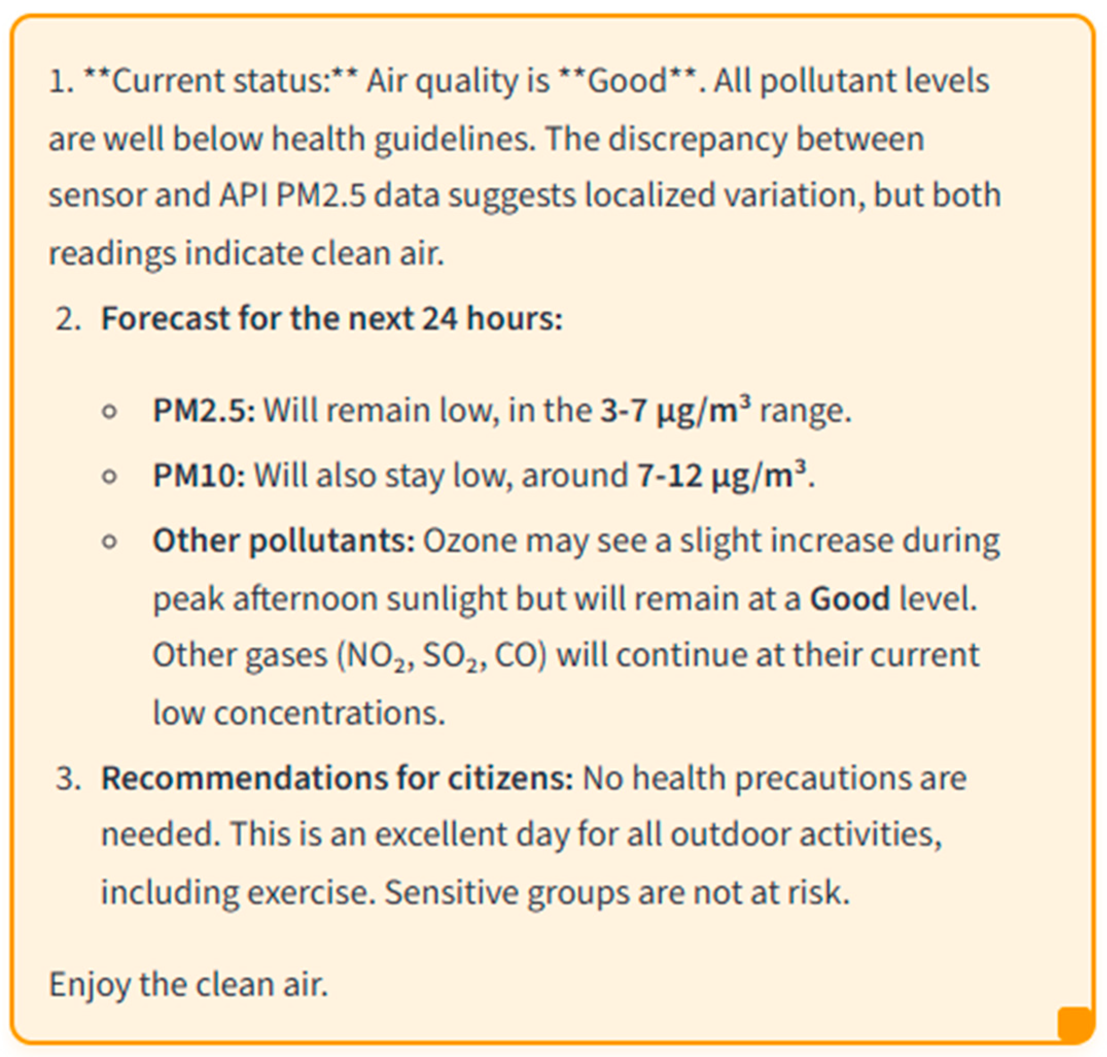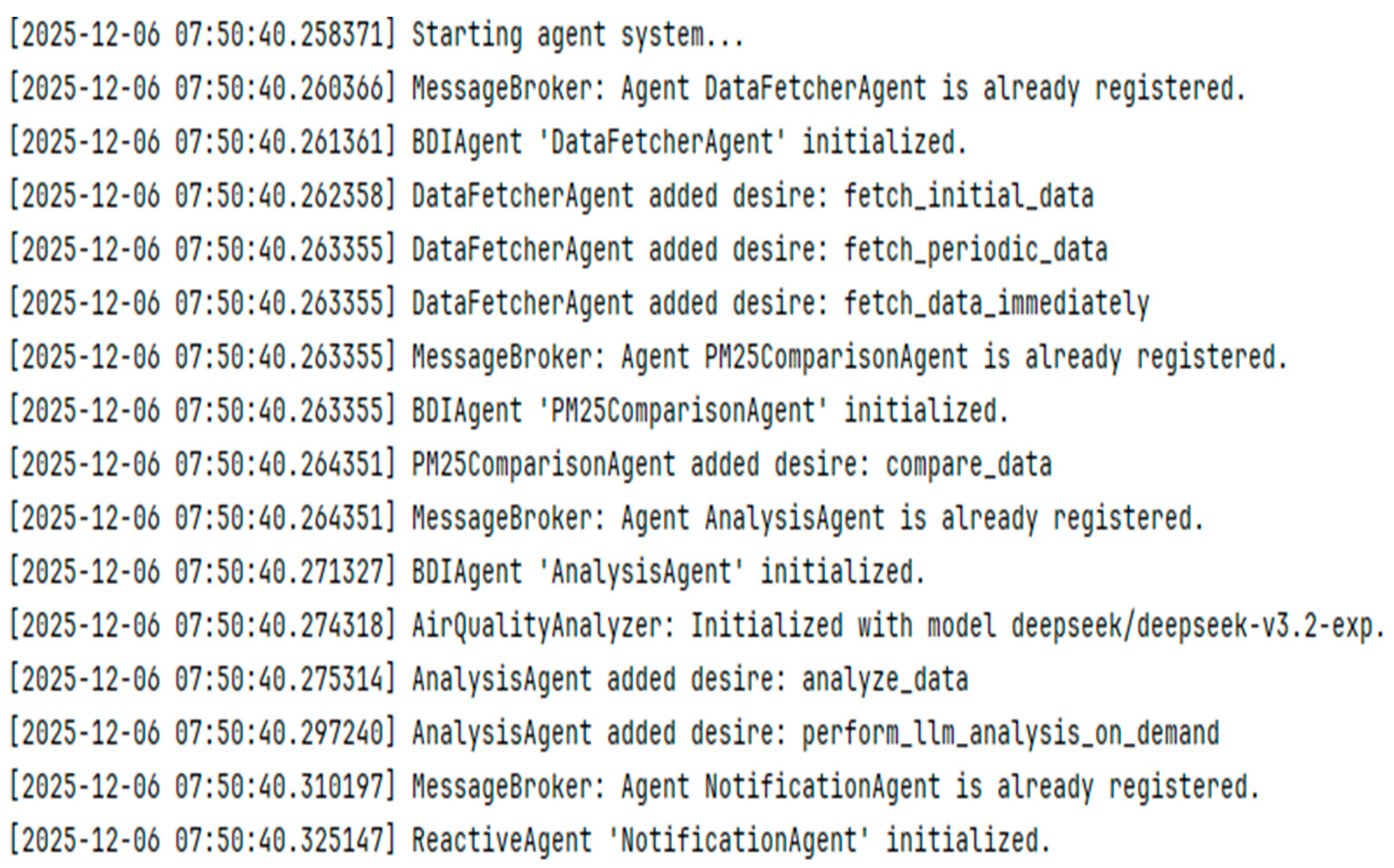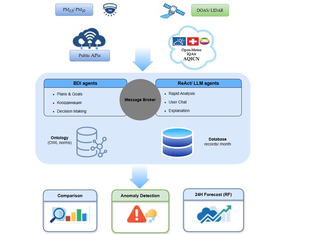 Operational Level. The next processing level is represented by the PM25ComparisonAgent and AnalysisAgent, which implement comparative and analytical functions in the system. Their operation is based on a cognitive approach: they not only compute statistics but also interpret results, extract patterns from the data, and formulate hypotheses, interacting with large language models (LLMs) for this purpose. This gives the system a better understanding of the meaning of the data and allows it to perform more complex analyses of environmental information. The agents function as independent experts who autonomously manage their actions by maintaining their own internal state and activation criteria. They determine for themselves when to act, based on time intervals and available data. The PM25ComparisonAgent and AnalysisAgent respond immediately to environmental changes, not simply waiting for events but proactively checking for them and planning their activities in advance. The agents work closely together, with the PM25ComparisonAgent providing data comparisons that the AnalysisAgent uses for deeper analysis performed by LLM. The PollutantWeatherAgent and NotificationAgent represent reactive units within the hybrid PLAM architecture. The PollutantWeatherAgent acts as a reactive analytical agent functioning as an interpreter of sensor data. It receives raw CSV data from external sources—specifically AQICN and IQAir, which relate solely to atmospheric conditions for each individual day—and performs a full processing cycle, from validation and parsing of the data to calculating metrics and statistical dependencies. At the core of its operation lies the concept of empirical cognition: the agent does not generate its own intentions but reacts to changes in input data, which then activate higher-order cognitive agents in the system. An important aspect of the PollutantWeatherAgent’s work is the use of an LLM. After processing all data, the agent passes it to the language model, which identifies causal relationships between meteorological factors and air pollution. The agent thus acts as a mediator between the empirical and cognitive layers of the architecture. The ForecastAgent extracts data from the AQICN and IQAir websites at a preset interval (default 30 min) and generates an alert when PM2.5 or PM10 levels are elevated. The agent integrates machine learning approaches (Random Forest Regressor), temporal analysis and data visualization, as well as automatic email notifications.