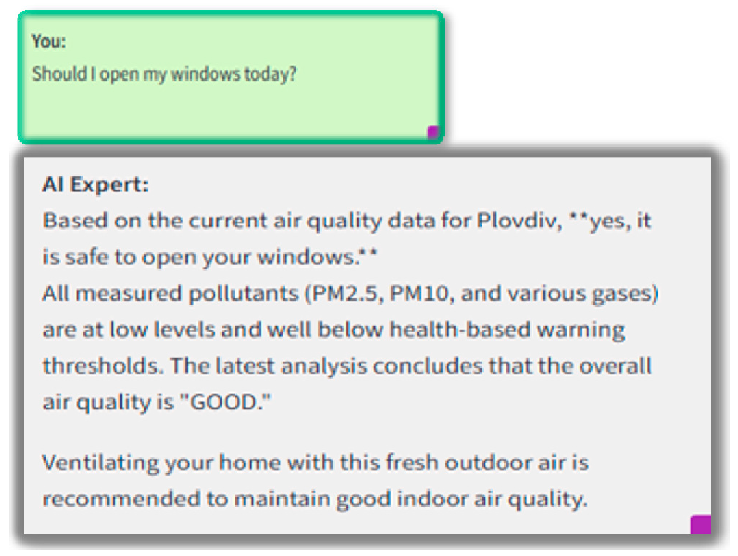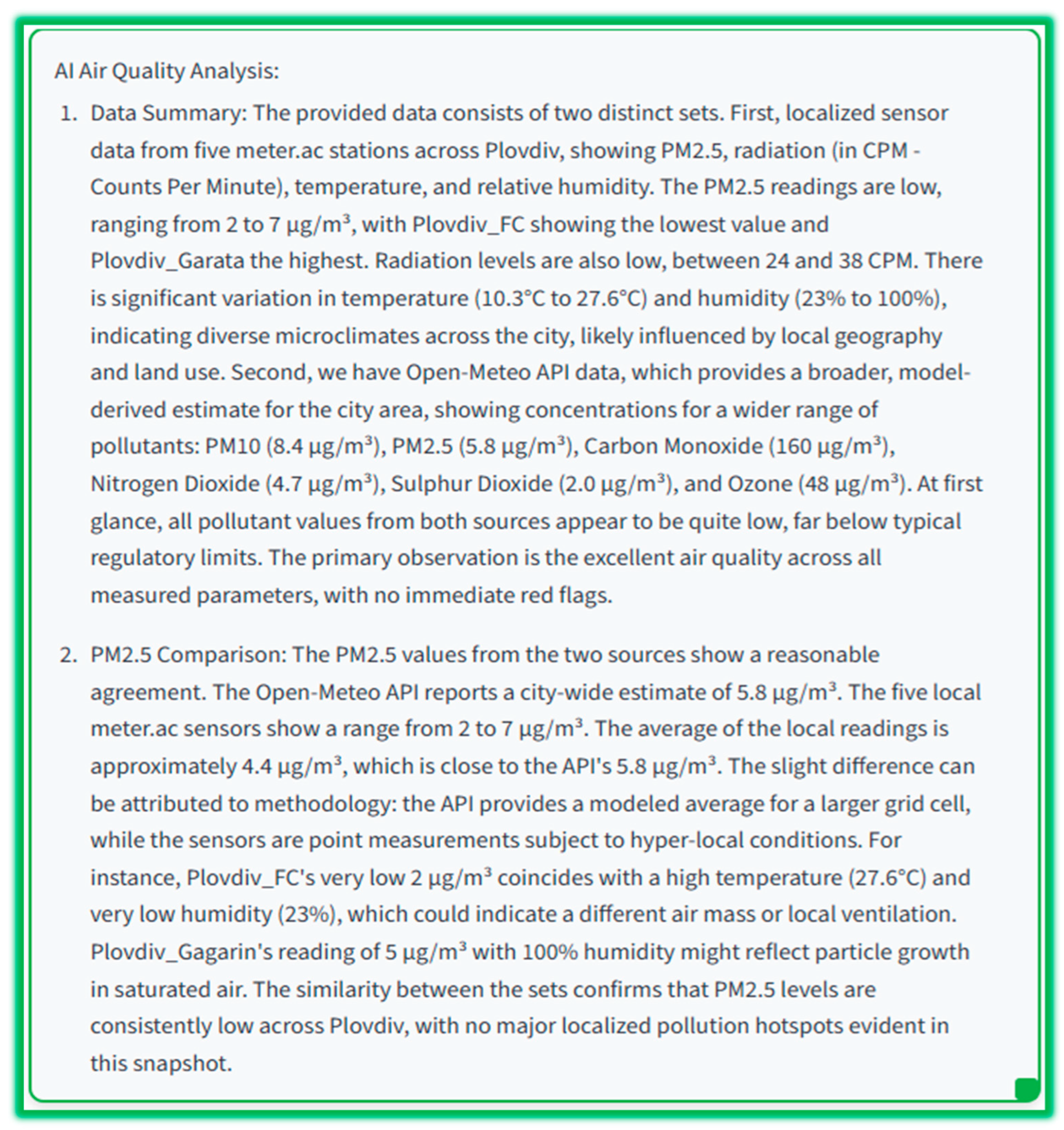 Most of the platforms presented in the review are global in nature, reporting on air quality over wide areas. There are good reasons for this—air pollution is transboundary. However, determining the objective air quality is difficult due to a number of local factors that affect air quality. Our goal is to build an objective “profile” of air quality in Plovdiv. In terms of the language model used, we are developing a small language model that can be fully deployed on our server configuration and trained with information specific to the Plovdiv area. Our goal is for our platform to use computing resources efficiently and sparingly. However, the platform can also be adapted for other areas (as demonstrated later in the article).