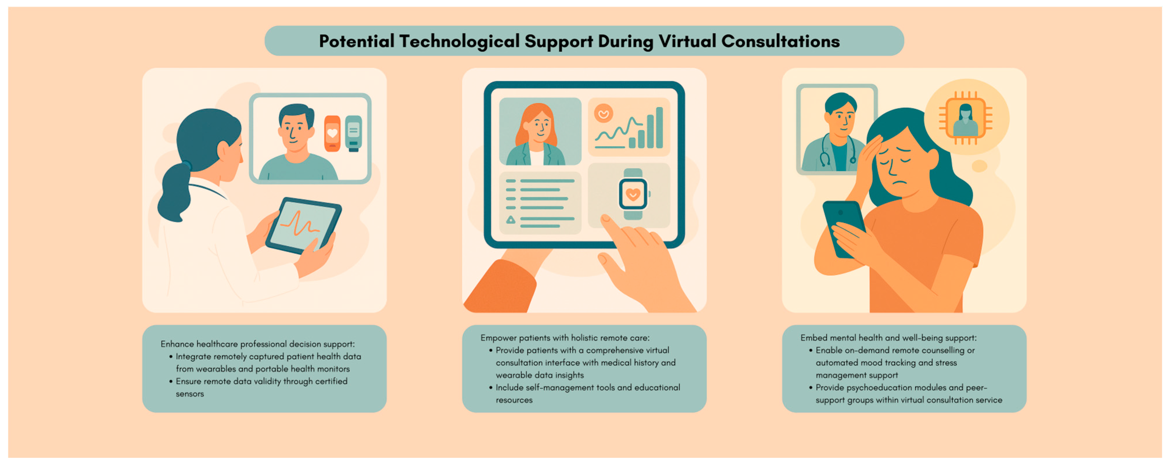 | Additional health status insights | Analysis from wearables and past medical records can provide HCPs with more insights and patients can better understand their status for self-management. | HCPs and patients | Technological ease and optimisation for holistic virtual care. “to me all them kind of gadgets, to me, should be linked to the virtual” “And maybe if you could monitor it then that that would be helpful to the person that was seeing you virtually. If you notice something yourself, you could just say say it to them maybe.” “I suppose my ideal, like if you’re doing something virtually, is that you know you have a good background. […] So you’re not going in kind of blind.” |