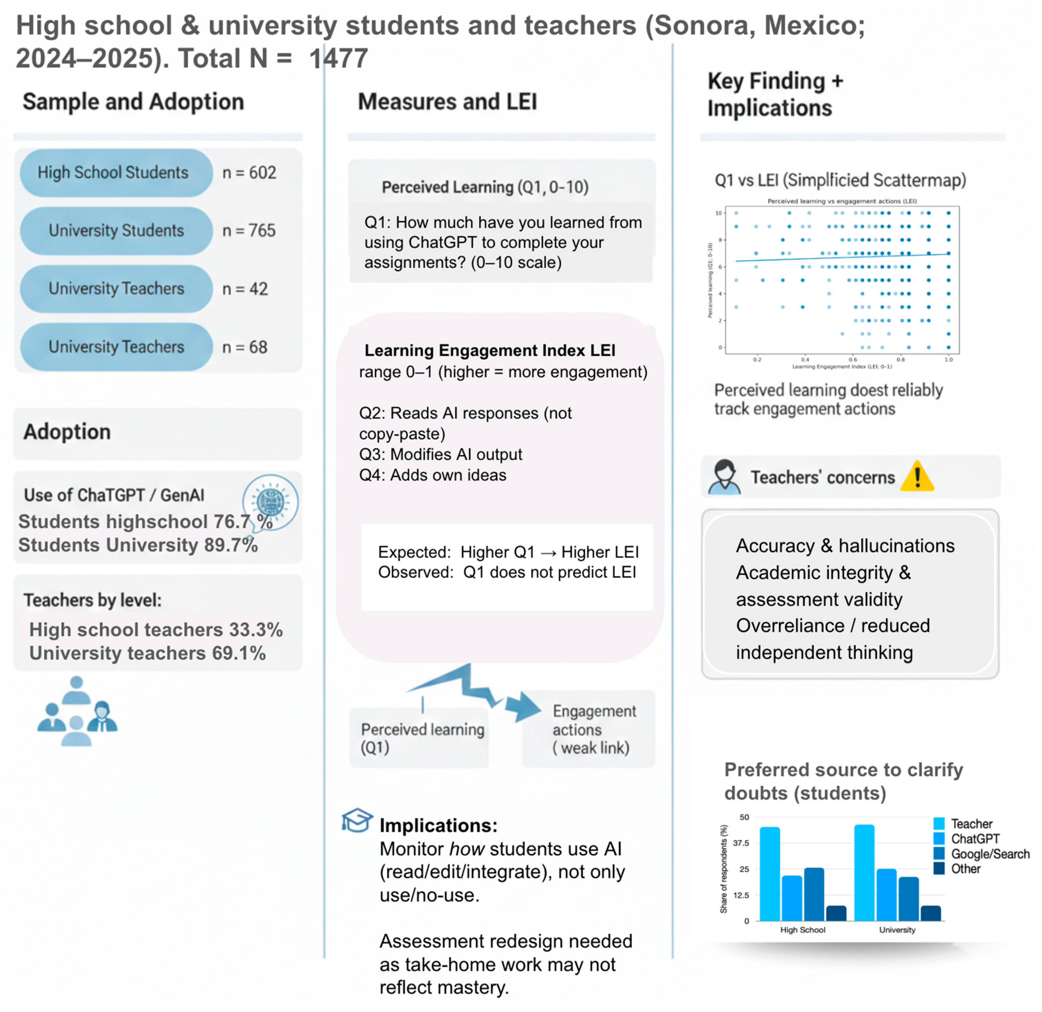This study addresses these gaps through a comparative analysis of GenAI use among high school students, university students, and teachers in Sonora, Mexico. We combine descriptive evidence with targeted inferential analyses to (i) characterize adoption and perceived benefits and (ii) test whether perceived learning aligns with engagement behaviors during AI-assisted work. To operationalize engagement, we propose a Learning Engagement Index (LEI) that summarizes students’ reported actions when using ChatGPT to complete academic tasks—reading AI outputs, modifying them, and integrating personal ideas—allowing an empirical comparison between perceived learning and engagement practices within the same sample.