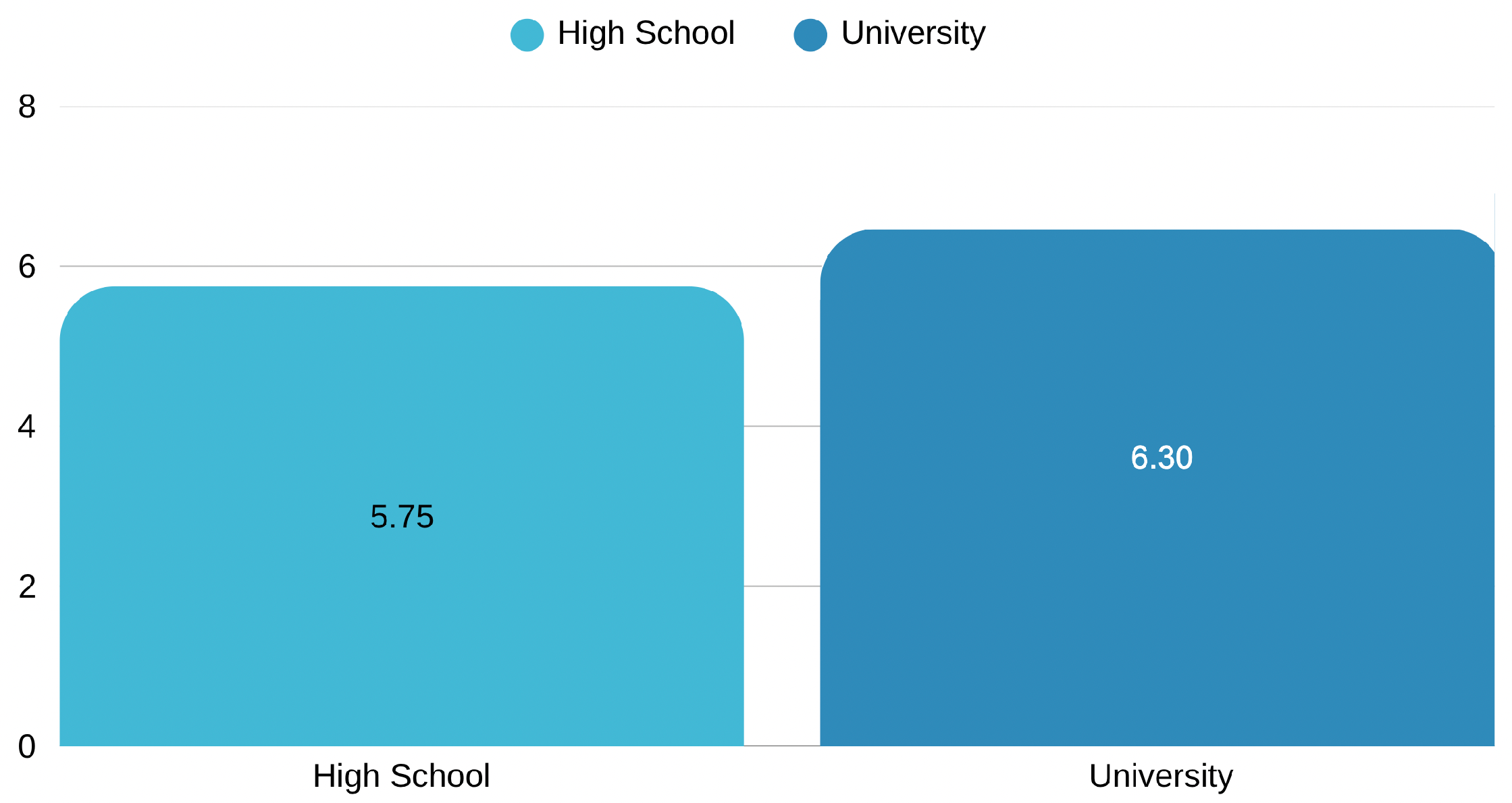 Perceptions of learning and productivity reveal both the educational potential and the cognitive risks associated with integrating generative AI into academic settings. Quantitative results indicate higher self-perceived learning gains among university students compared with high school students, alongside a progressive normalization of AI-assisted study practices. Among high school students, the average self-reported learning score on a 0–10 scale was 5.75 (n = 584; excluding non-responses), suggesting a moderate perceived benefit.