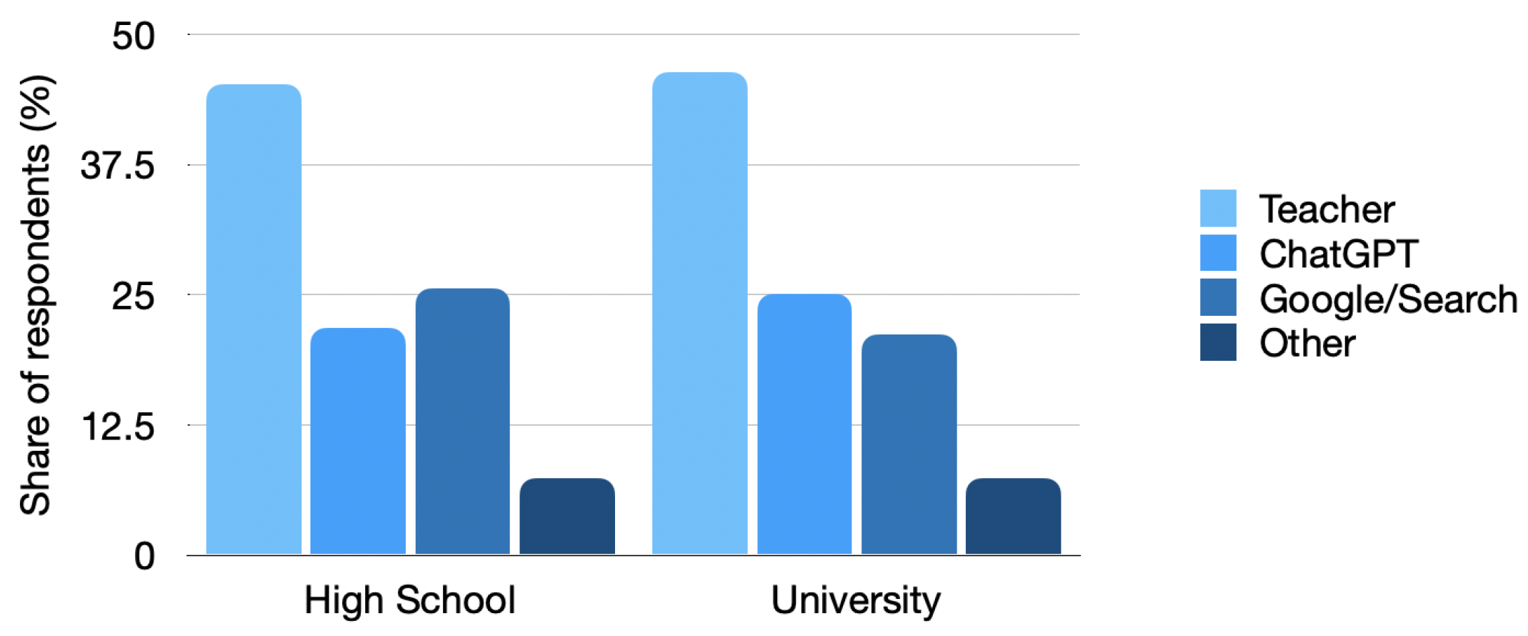 University students often described a more differentiated, situational use of resources (e.g., ChatGPT for initial structuring, Google for exploration, and teachers for validation and contextual refinement), although fully consolidated hybrid strategies were not consistently dominant. Teachers’ perspectives aligned with these tensions: high school instructors emphasized concerns about accuracy, assessment integrity, and classroom dynamics, whereas university instructors framed AI tools as part of an evolving academic environment requiring new forms of pedagogical mediation. Across both levels, educators noted that their role increasingly involves helping students evaluate, verify, and contextualize AI-generated information rather than merely transmitting content.