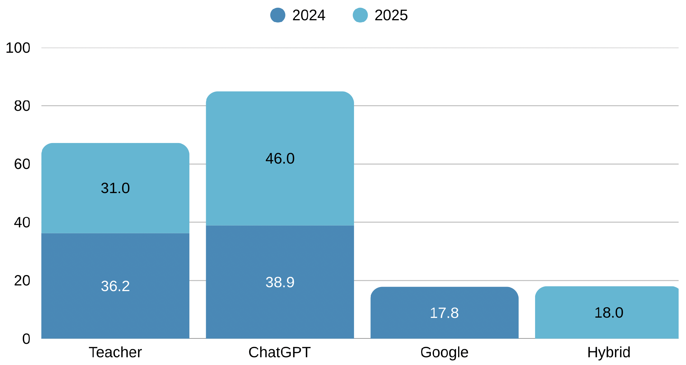 Within the university subsample, preferences were also stable across survey years. Comparing 2024 (n = 303 valid responses) and 2025 (n = 458), teachers remained the most frequently preferred source in both cohorts (46.5% vs. 46.3%). Preference for ChatGPT increased slightly in 2025 (23.4% vs. 26.2%), while preference for Google decreased marginally (21.8% vs. 20.7%); “other” responses remained infrequent (8.3% vs. 6.8%). However, the overall distribution did not differ significantly by year (, p = 0.754; Cramér’s V = 0.040), suggesting that year-to-year changes were modest. Qualitative analysis of students’ open-ended justifications (coded using the same thematic methodology applied throughout the study, with three independent reviewers and consensus resolution) clarifies the motives underlying these preferences. High school students who preferred teachers emphasized trust in expertise, clarity, and the ability to provide personalized, context-specific guidance; the affective dimension was prominent, with comments indicating that teachers “understand how I learn,” “give concrete examples,” or “explain in a way that feels real,” underscoring the continued importance of relational trust.