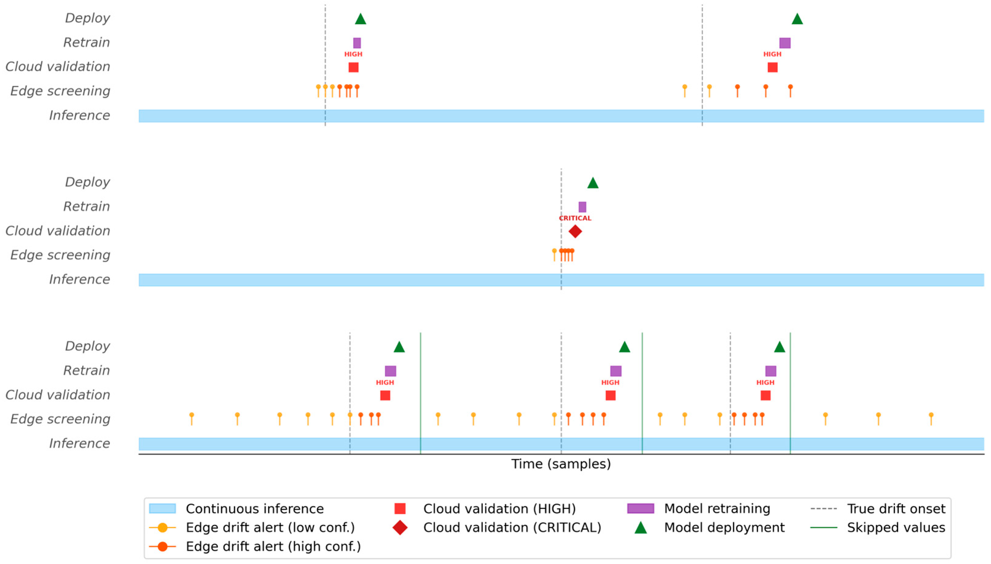 Figure 4 indicates that all five cloud-validated drift events cluster near the documented phase boundaries, with no validated events occurring during periods of known distributional stability. The pipeline-only latency (cloud validation through deployment) for the real CGM user was approximately 6 s, consistent with synthetic user measurements. This qualitative alignment, combined with the strict cloud filtering that reduced approximately 2000 edge alerts to only 5 validated events, provides supporting evidence that the hierarchical validation correctly discriminates between physiologically meaningful drift and transient variability. This suggests that the proposed design generalizes across heterogeneous physiological signals and can accommodate realistic noise patterns encountered in practice.