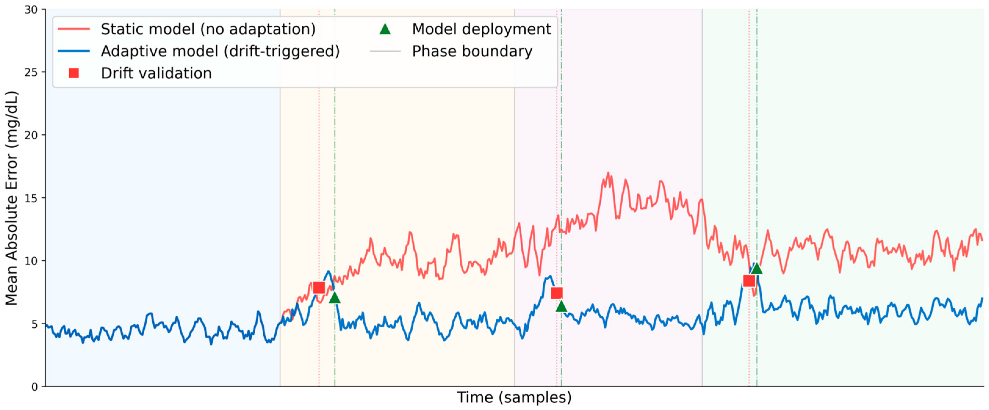 Figure 4 shows MAE over time with (blue line) and without (red line) the model update for the real CGM user, annotated with drift validation (red squares and dotted line) and adaptation events (green triangles and dash-dotted line).
