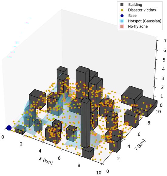 As shown in Figure 2, to simulate the distribution of communication demands in disaster-stricken areas, a compound Poisson process is employed to generate user locations. First, clustering zones are generated centered around 10 random points, with locally aggregated disaster victims generated according to a Poisson distribution of specified intensity. Subsequently, affected individuals were randomly generated at uniform density across the entire urban background area. After merging these two components, 600 affected individuals were randomly sampled to construct a demand scenario featuring both local clustering and global randomness. Concurrently, areas were comprehensively scored based on population density, disaster severity, and no-fly zones, resulting in six zones and the generation of 36 candidate deployment points.