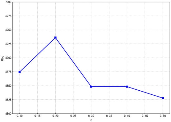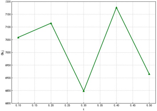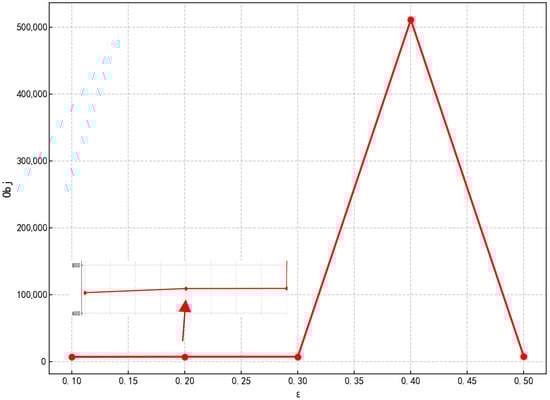 Visualize and compare the target values of three types of probabilistic distance metrics under different tolerance parameters, characterizing their trend characteristics and differences as tolerance varies. Figure 4 illustrates the variation of total system cost with tolerance value in the L∞-norm-based metric method. The cost curve exhibits significant fluctuations, particularly showing abrupt changes when the tolerance value ranges from 0.3 to 0.4. This indicates extreme sensitivity to path variations within the uncertainty set, reflecting a high cost for achieving robustness assurance.
