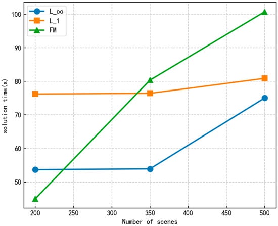Analyzing the impact of the number of discrete scenarios on experimental results reveals that, as shown in Figure 7, the total system cost increases with the number of scenarios. This indicates that a higher number of discrete scenarios leads to increased time complexity. As depicted in Figure 8, the model’s computation time also steadily increases.