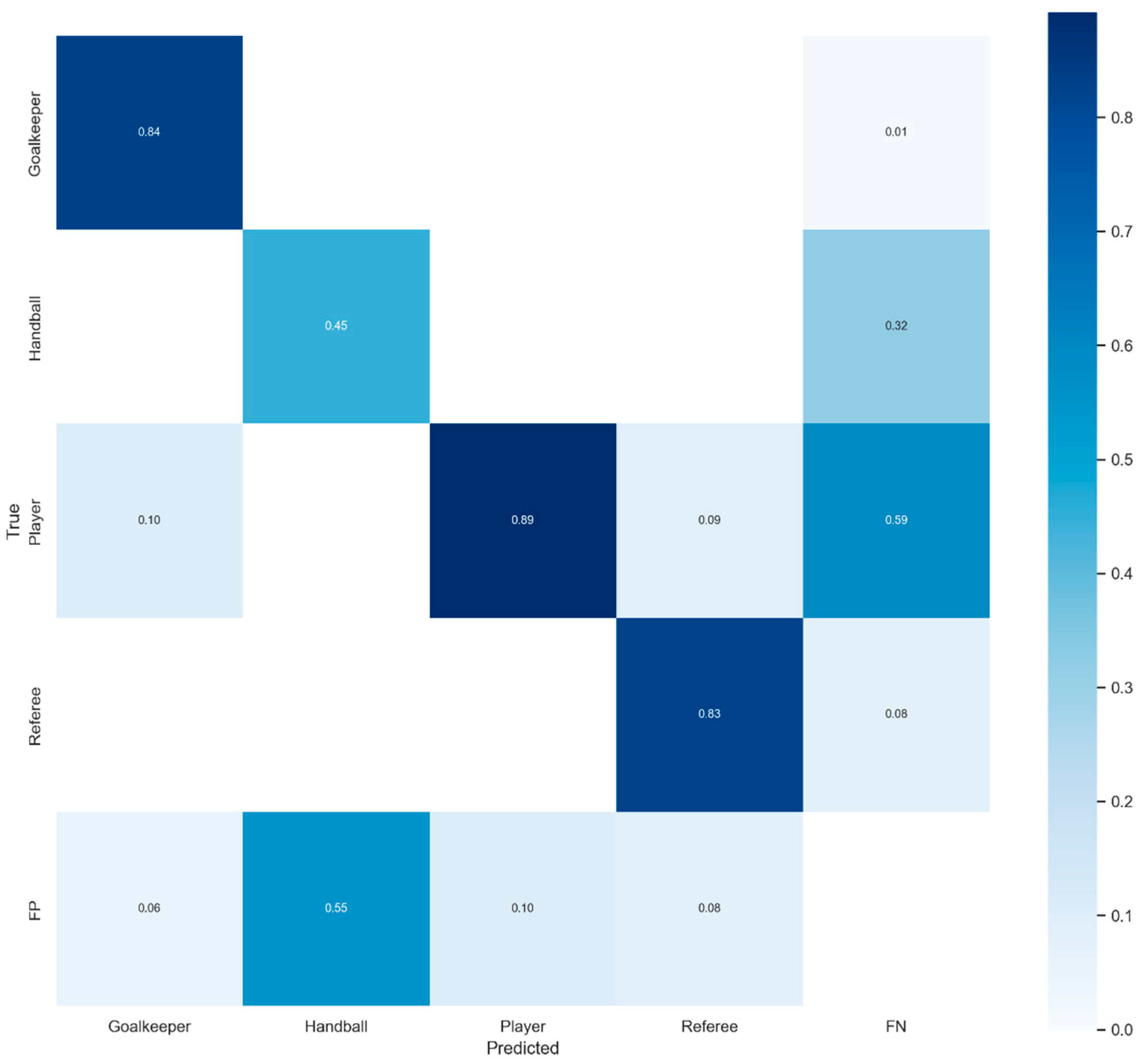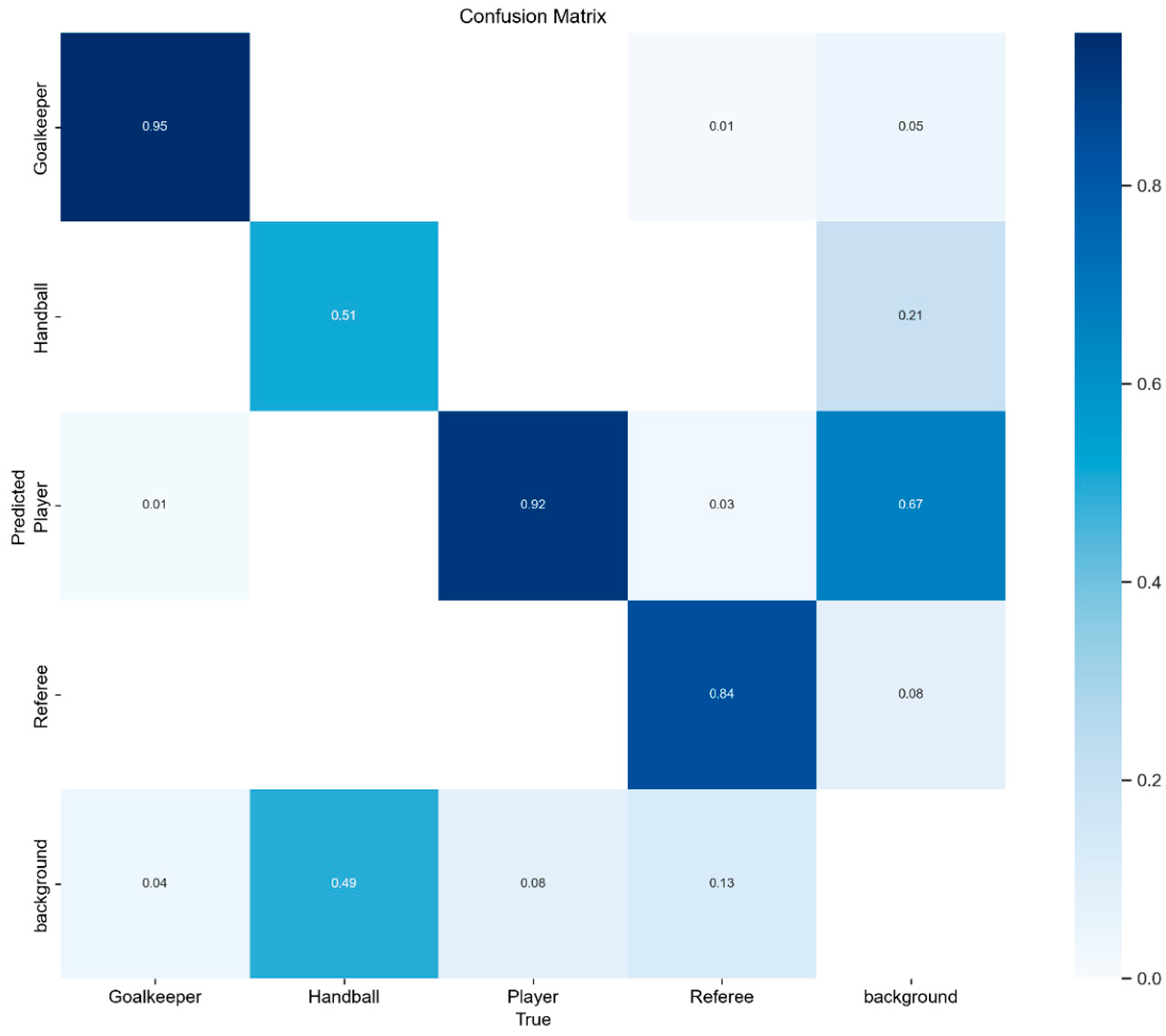- Statistical validation: The current results are based on a single experimental run evaluated on a relatively small held-out test set of 72 images, without k-fold cross-validation or multi-run variance reporting. Future work should prioritize k-fold cross-validation (e.g., 5-fold or 10-fold) to obtain more reliable performance estimates and confidence intervals; multi-run experiments with different random seeds to quantify result variability; and evaluation on an independent external handball dataset.