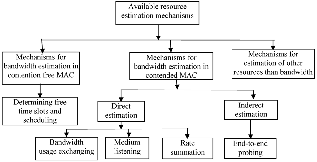 - Resource estimation technique: ConserRate—This technique is based on conservative rate and current traffic rate; RateSum—Rate summaration; Listening—Medium listening; Timeslot—Determining free timeslots and scheduling; Probing—End-to-end probing; Exchange—Bandwidth usage exchanging; ExBwRE—Technique for estimation of other resources than bandwidth